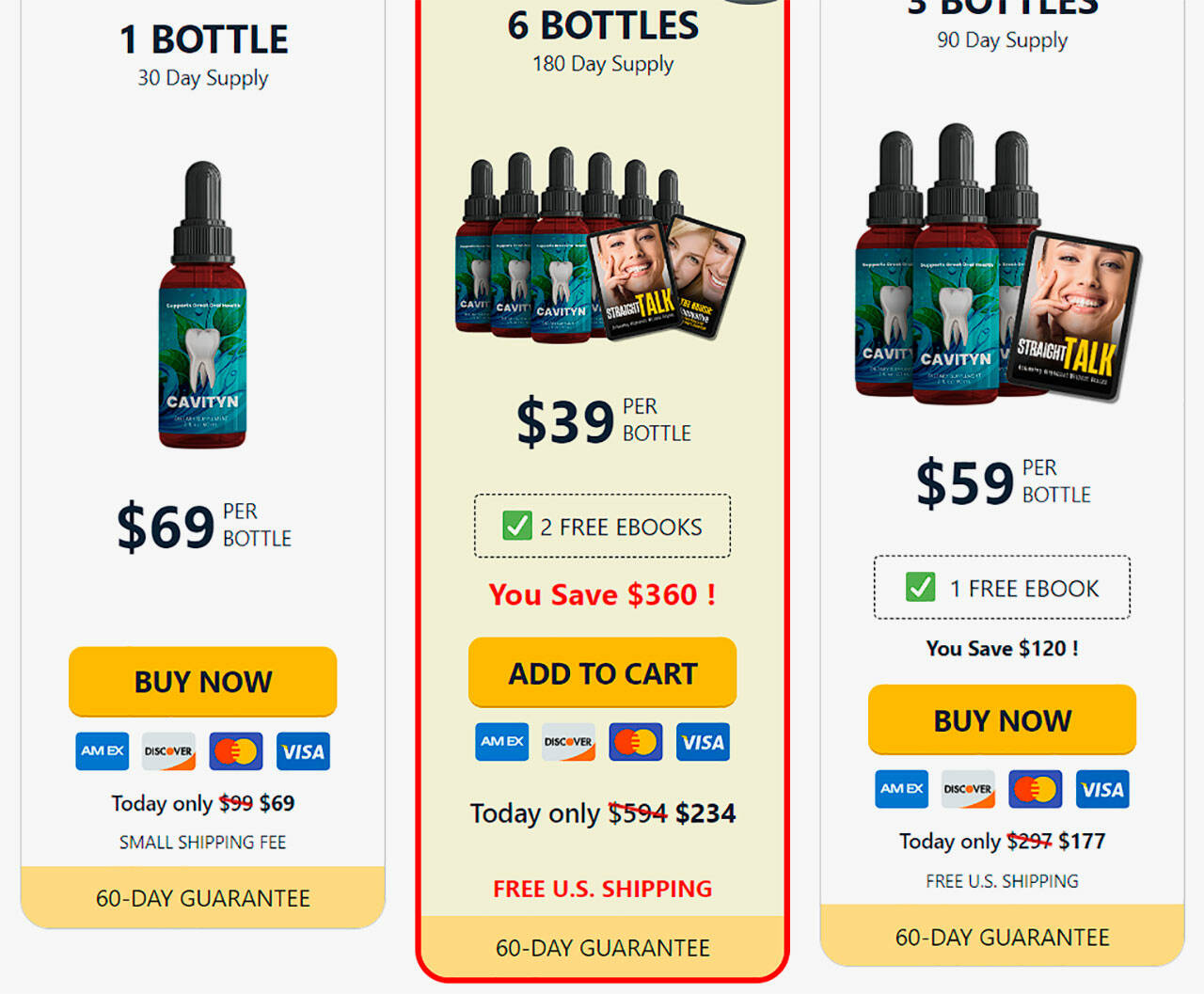 - 6 Cavityn bottles: $39 each + free domestic shipping + 2 bonus eGuides