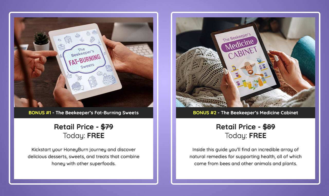 - Order three bottles of HoneyBurn for $59 per bottle + get two bonus e-books