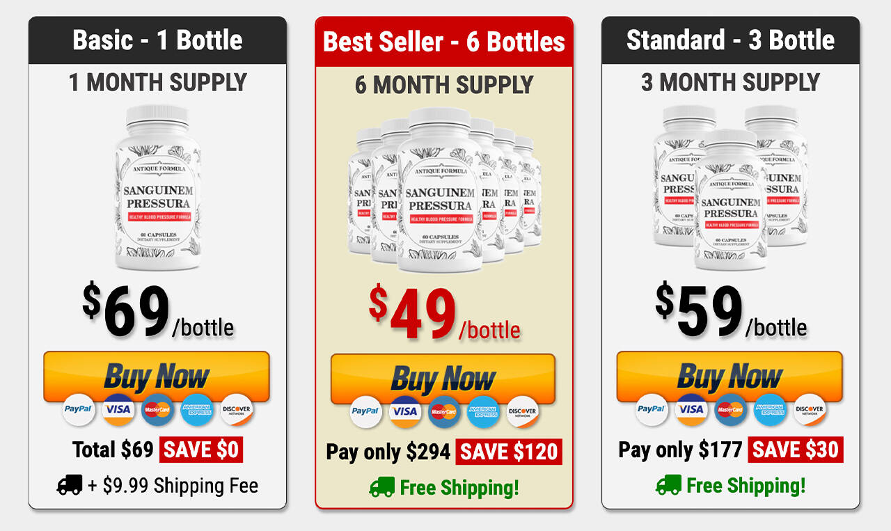- Six bottles of Sanguinem Pressura at $49/ bottle + free shipping + two free bonuses.