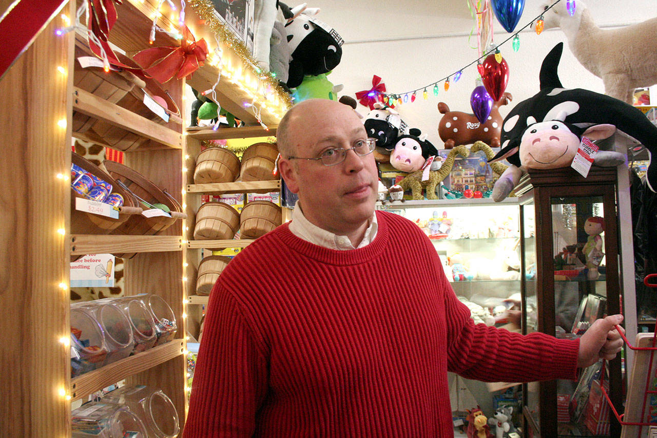 Framed by white lights in his new Whistle Stop Toys location, owner Steve Goldenbogen already has been filling holiday orders.