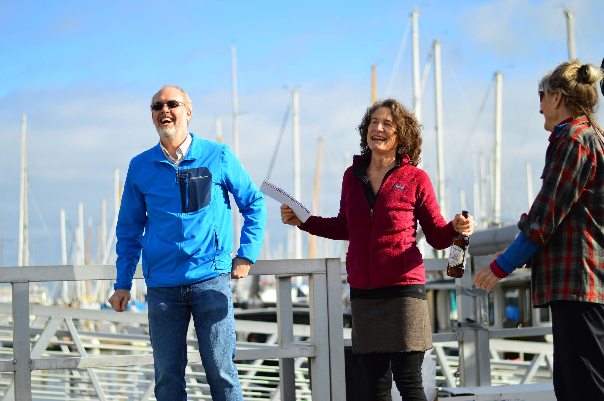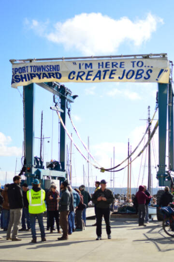 Port of Port Townsend Commissioner Pam Petranek, below center, christens the port’s new 75-ton Travelift by whacking a bottle of Port Townsend Brewing Co. beer on it Wednesday afternoon. Port Executive Director Eron Berg and newly seated Port Commissioner Carol Hasse, right, joined her for the celebration at the Boat Haven. The port purchased the $561,185 lift with $150,000 in funding help from Jefferson County, Berg said. It replaces a smaller 70-ton hoist, which the port will keep because it fits into some interior shop spaces.