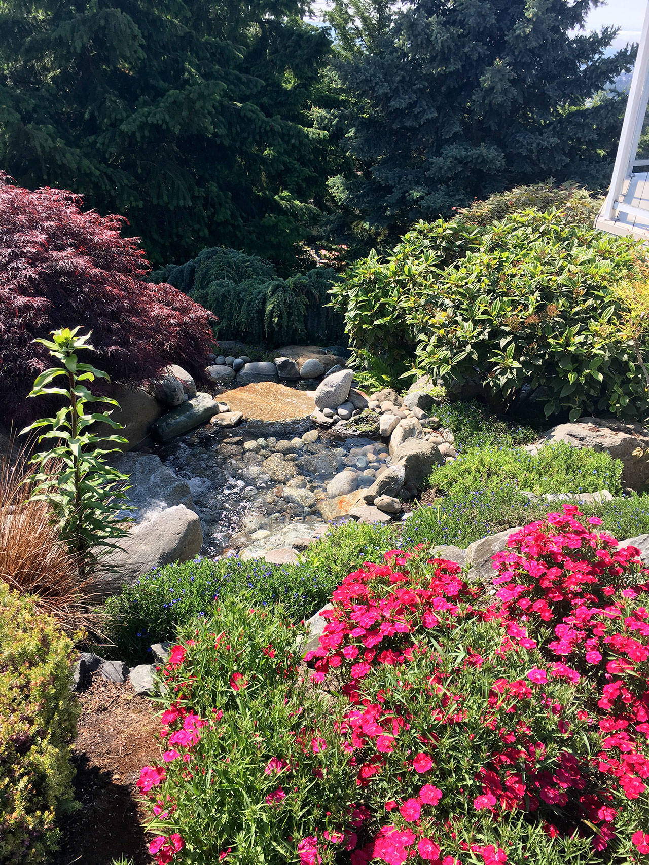 Japanese maples, pieris japonica, coral bells, lupines, and mock orange are only a few of the plantings spaced throughout the landscape.