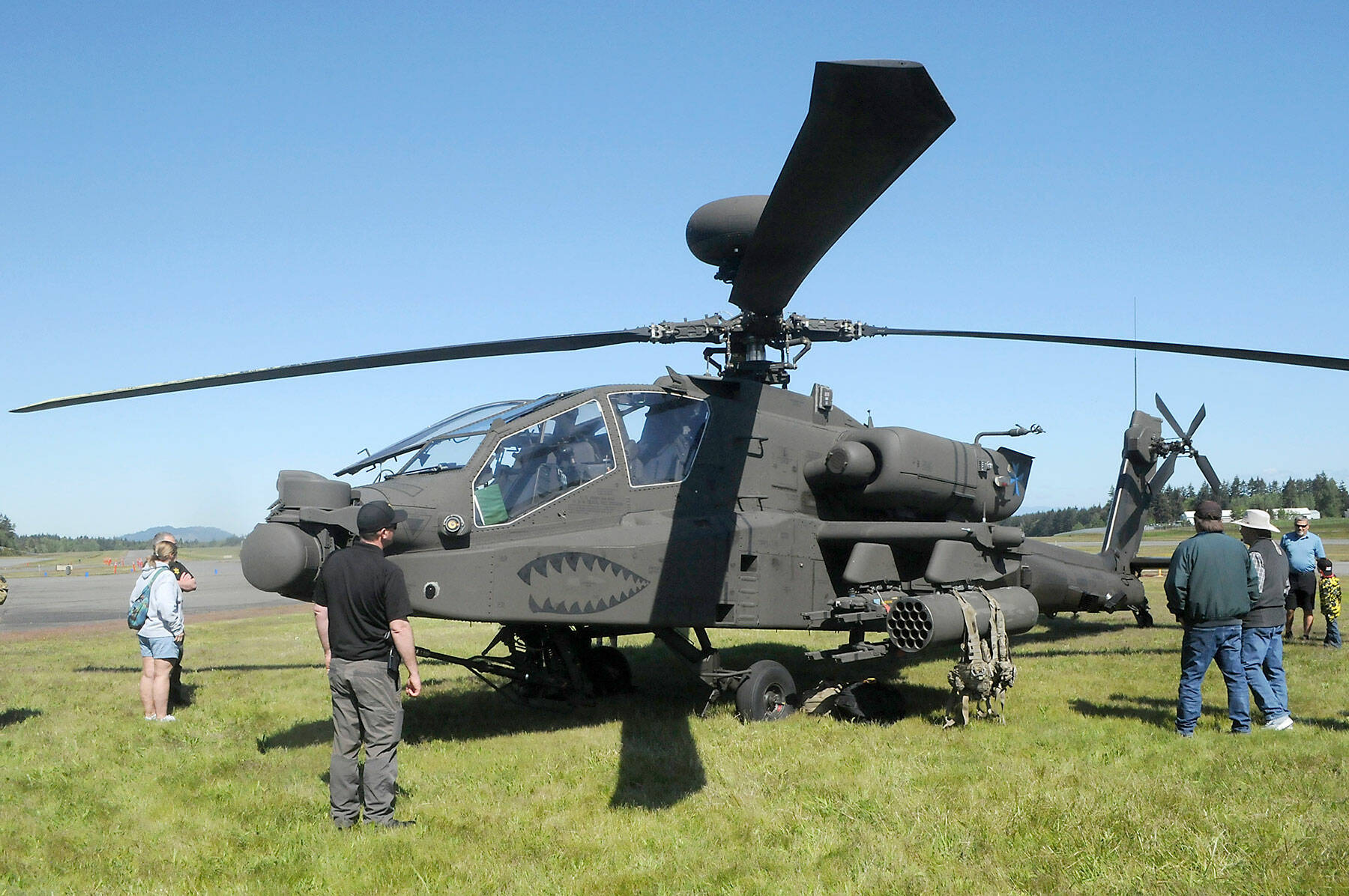 An AH-64 Apache helicopter from Joint Base Lewis McChord stands on display on Saturday at William R. Fairchild International Airport. (Keith Thorpe/Peninsula Daily News)