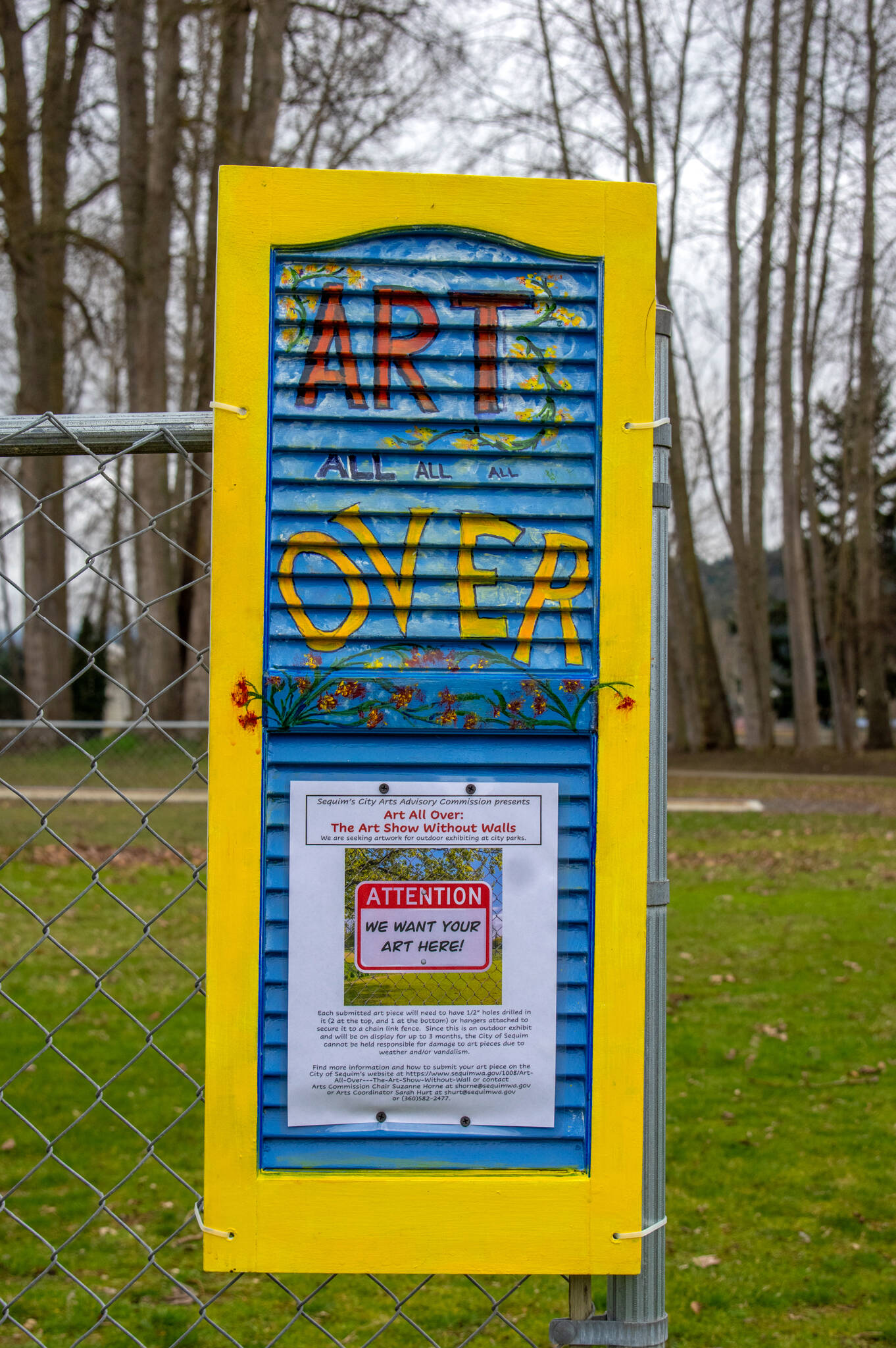 The commission has permission from city officials to hang art on chain link fencing at city parks so that passersby can enjoy them while on walks. Carrie Blake Community Park was the first to receive art this past weekend.