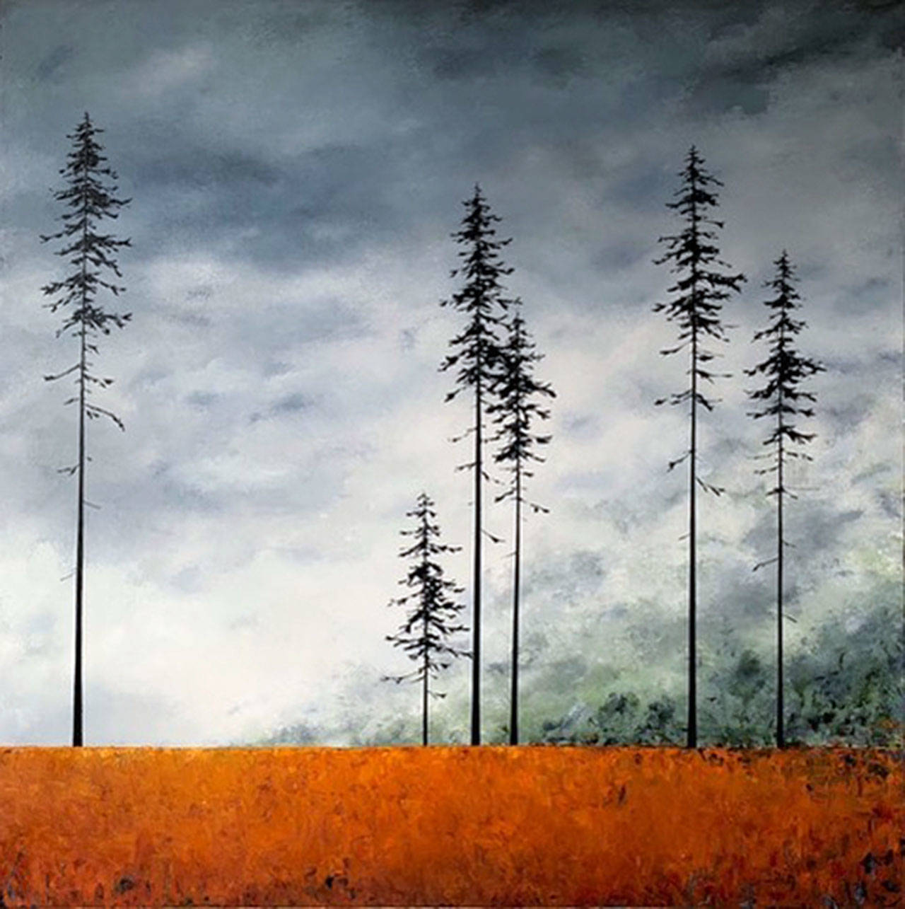 Her oil paintings with palette knives show wide horizons with stately trees, or the quick pose of a small bird on a slender branch.