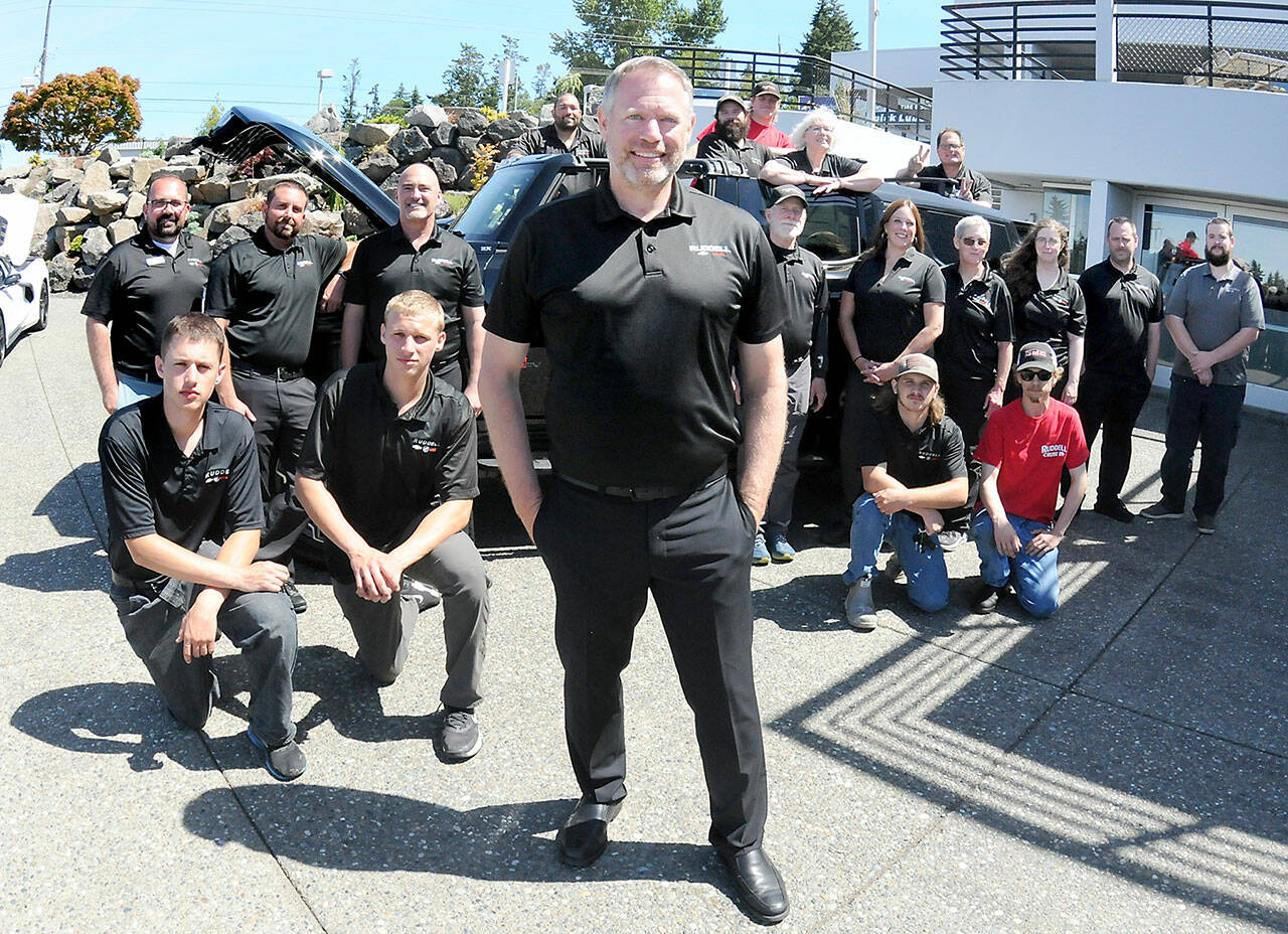 Vintage cars line up along Golf Course Road waiting entry into the 29th annual Ruddell Cruise-in car show on Friday at Ruddell Auto in Port Angeles.