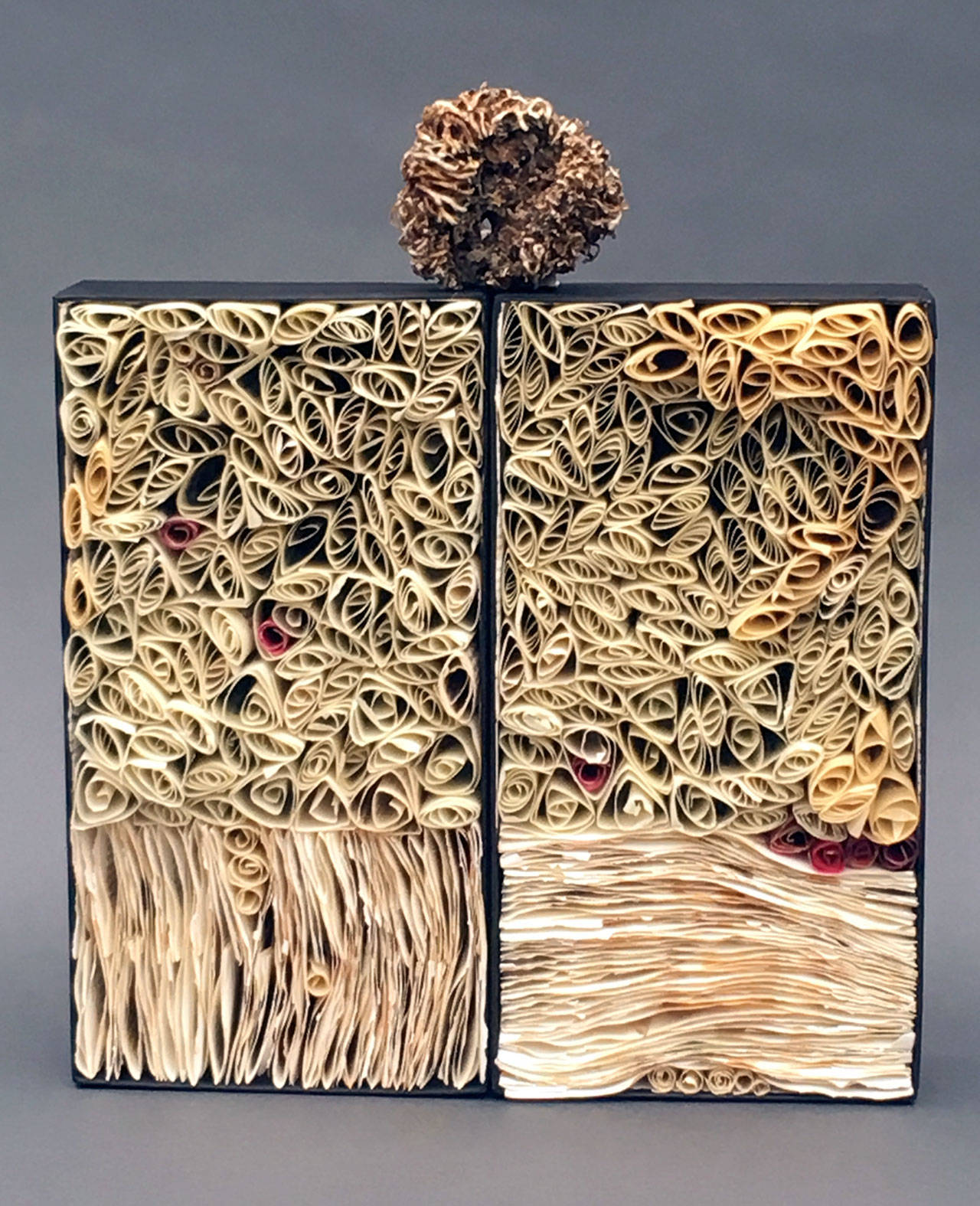 She often uses fabrics inherited from her mother for the linings to add a multi-generational layer. Each is meant to be handled and viewed from all angles. Many pieces are hand-quilted using the Japanese style of embroidery called “sashiko.”