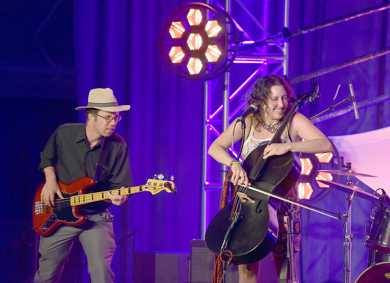 Frontwoman Rebecca Roudman of Novato, Calif., right, and bassist Colin Williams perform with Dirty Cello on the Main Stage at Vern Burton Community Center on Saturday at the Juan de Fuca Festival. (Keith Thorpe/Peninsula Daily News)