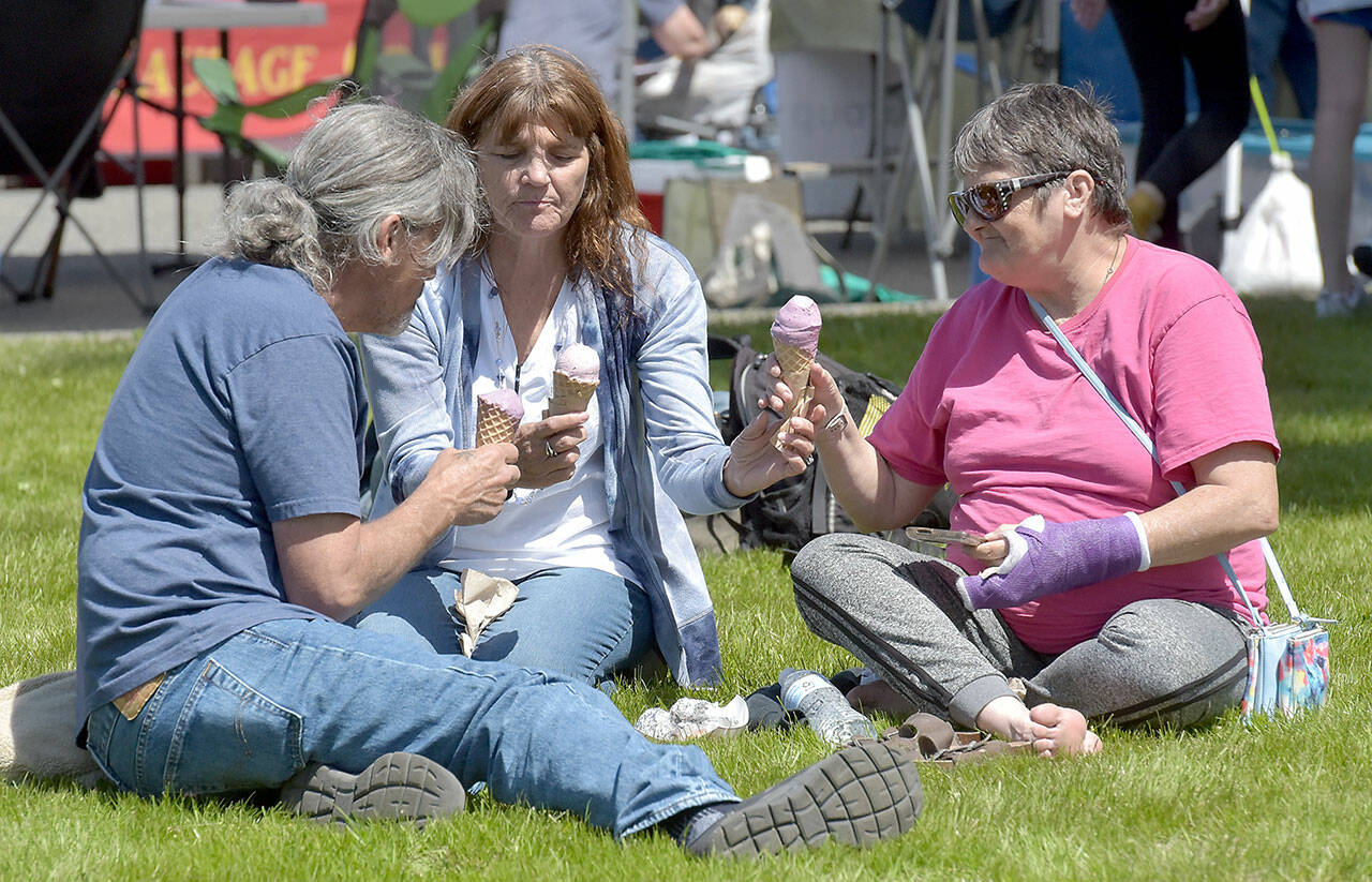 Terry McGinness, Kathleen O’Rourke and Tonya McGinness, all of Port Angeles, enjoy ice cream cones on the lawn of Vern Burton Community Center during Saturday’s session of the Juan de Fuca Festival in Port Angeles. (Keith Thorpe/Peninsula Daily News)