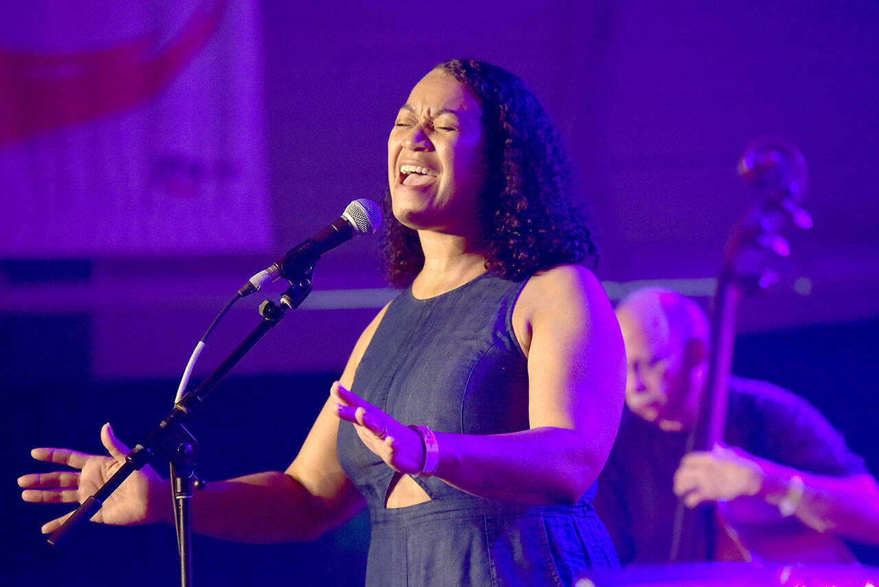 Jacqueline Tabor sings with the Jacqueline Tabor Jazz and Blues Band, including bassist Ted Enderle, right, on Friday at Vern Burton Community Center. (Keith Thorpe/Peninsula Daily News)