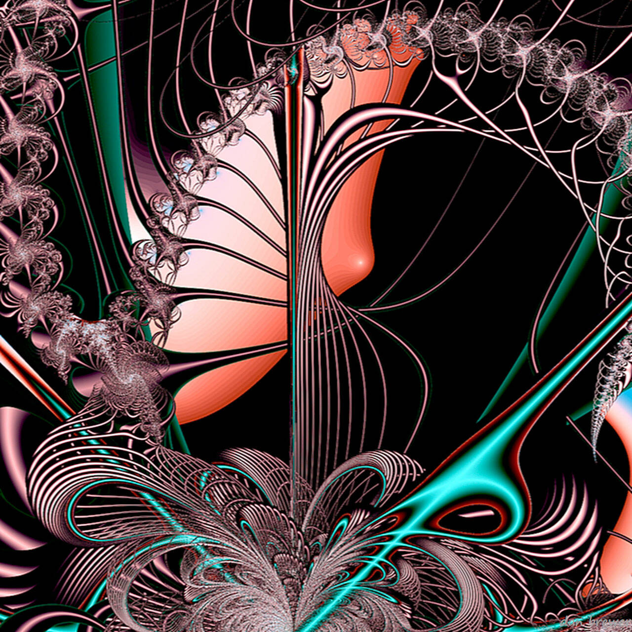 His fractal work remains true to the generating equations. It has no layering or partial editing of color. Nor is it redrawn, touched up, or painted in or out of the computer.