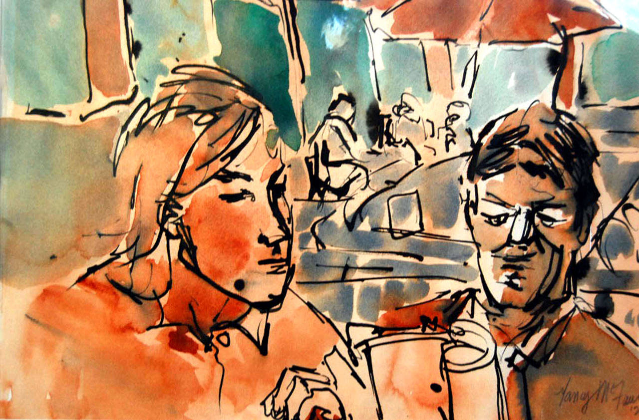 Using pen and ink and adding watercolor, McFaul paints everyday objects, scenes, people and imagined encounters she experienced over the past year to create her multimedia art.