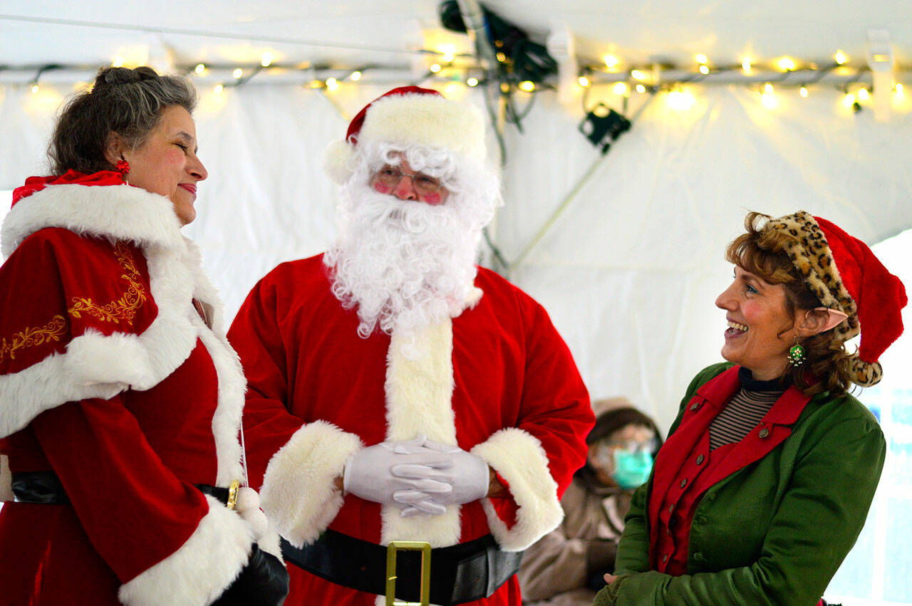 Santa Claus, surrounded by Mrs. Claus, left, and Kimberly the Elf, greeted community members of all ages on Saturday under the Tyler Street Plaza tent in downtown Port Townsend. Santa, known at other times of year as Nathan Barnett; Mrs. Claus, aka Cindy Madsen and Kimberly Snow — “that’s my real name” — were part of the Main Street Program’s seasonal activities. “With the holidays, the diet is not going well,” Barnett admitted, “but Mrs. Claus is getting me an exercise program for Christmas.” (Diane Urbani de la Paz/Peninsula Daily News)