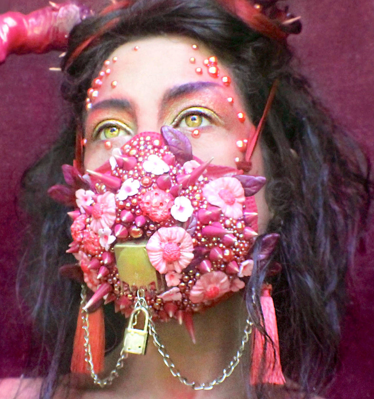 Hawkins, a multimedia painter, sculptor and illustrator, also dug deep into her feelings about the crisis. Her mask, titled “Pandemia,” portrays both the villain of illness and the springtime world, with epoxy clay flowers and leaves, metal spikes, faux pearls, gold hardware and silk tassels — handpainted and attached to a used N-95 mask.