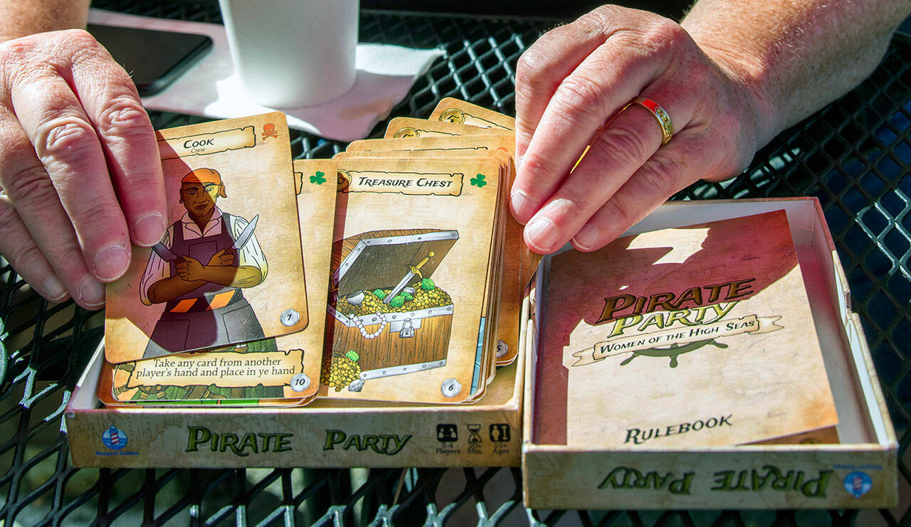 Pirate Party is a card game for two to four players, ages 10 and older, with 65 different cards, and it’s centered around female pirates from history (see piratepartygame.com). She hired Laura Erwin for the graphic design and illustrations.