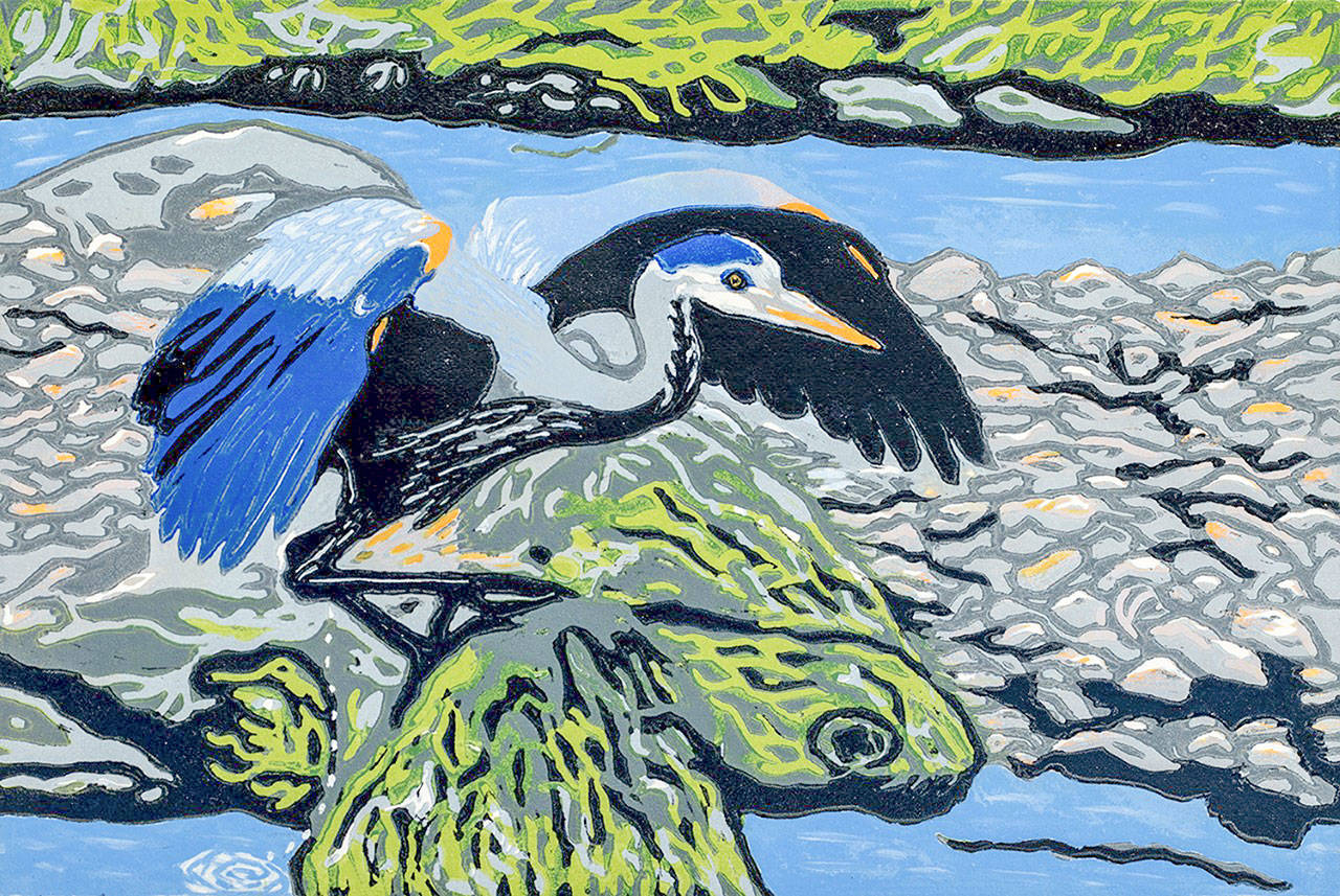 Then, he transfers the sketch onto the block of wood and prints the lightest color in editions of 10-12 original prints. After each printing, he then carves away that color and prints the next color, some up to 15 colors.