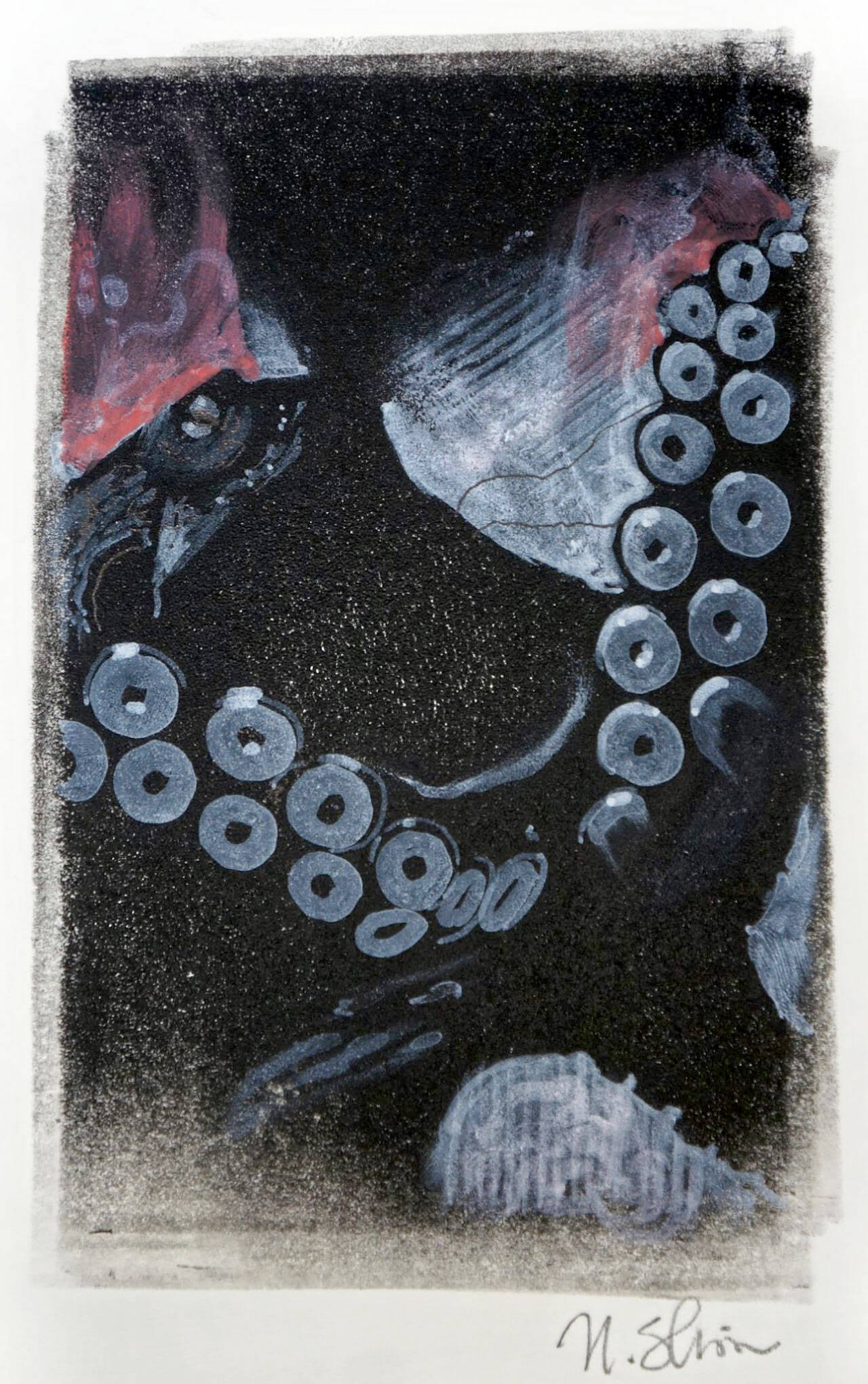Shields, a teacher at Crescent School in Joyce, is displaying recent drawings and prints that focus on irrational fears.