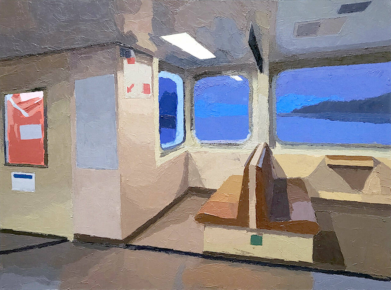 “Ferry Booth” by Aubrey Benasa of Seattle is an oil painting of a classic scene, while “Direct Line to Nature” by Joshua Phelps of Edmonds is a comical photo of a phone booth.