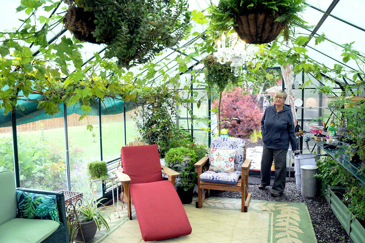 Laurie McKechnie of Sequim explores a greenhouse on the grounds of Life Spring Farm, owned by the Haley Family in Happy Valley south of Sequim, one of five locations featured in Saturday’s 28th annual Petals & Pathways home garden tour. The event was hosted by the Master Gardener Foundation of Clallam County. (Keith Thorpe/Peninsula Daily News)
