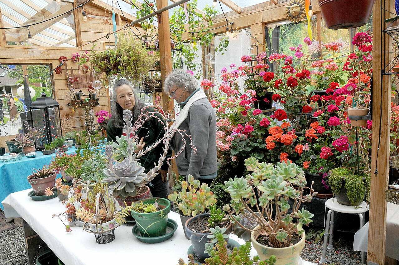 Master Gardener Program members Nancy Kohn, left, and Betsy Burlingame study a table of succulents in a greenhouse at Sanger Sterling Garden, owned by Tanya and David Unruh, in Happy Valley south of Sequim, a showcase stop on Saturday’s 28th annual Petals & Pathways home garden tour. The event was hosted by the Master Gardener Foundation of Clallam County. (Keith Thorpe/Peninsula Daily News)