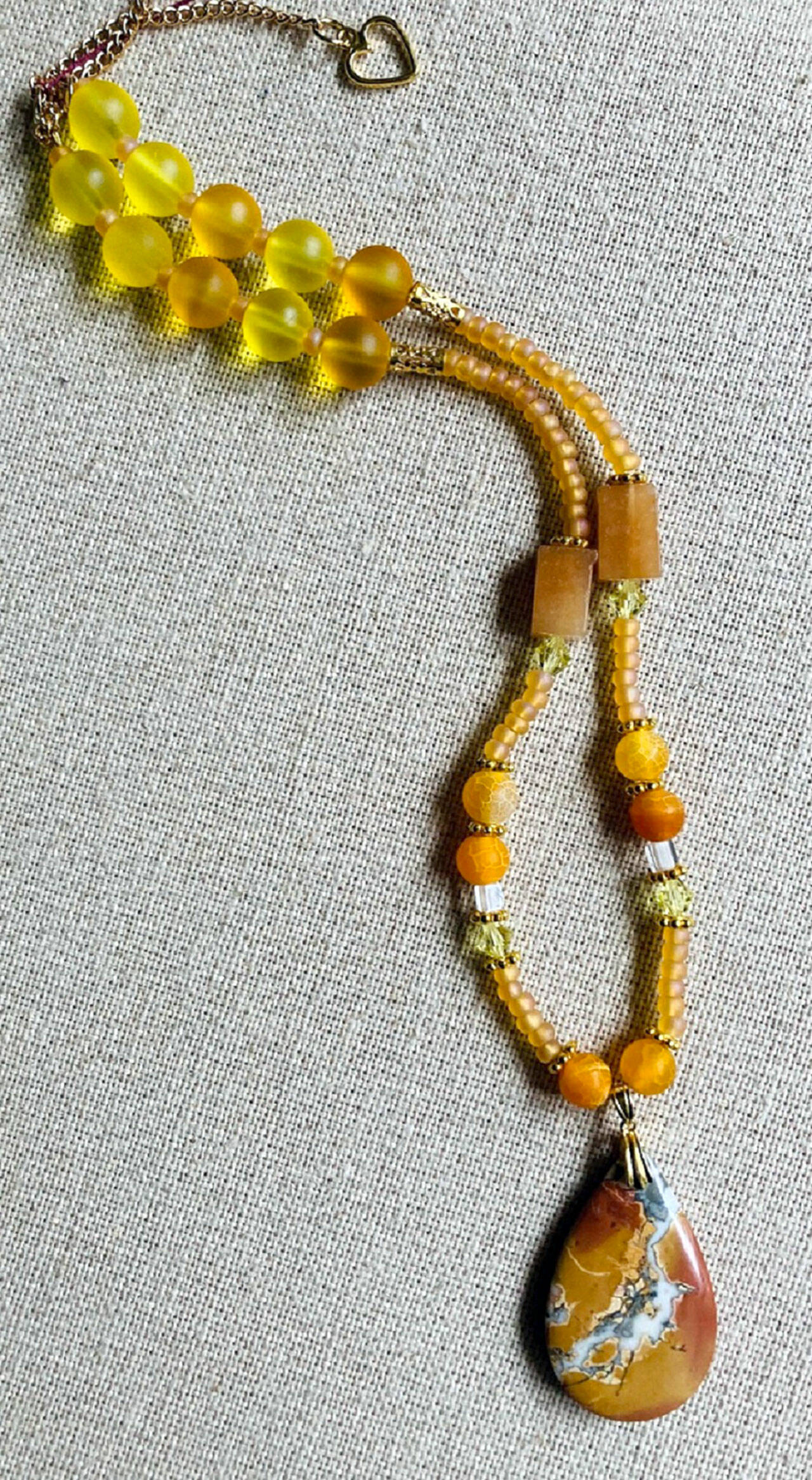 Gruber, while known for her oil paintings, also creates jewelry. Her latest collection features an array of hand-blown glass beads, pendants and precious stones such as variscite, pendritic opal, brecciated mookaite and black obsidian crystals.