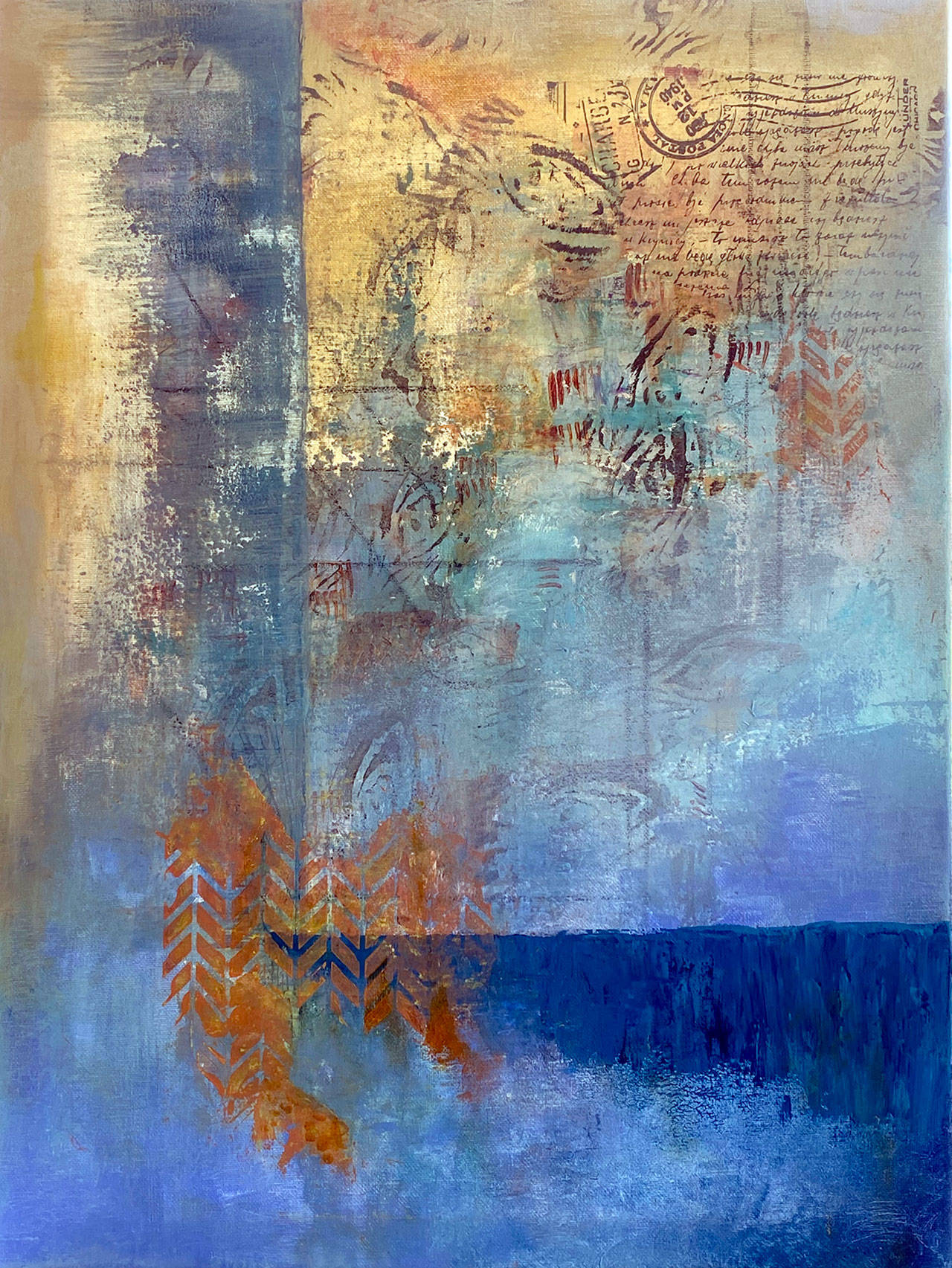 The abstract art critique group, hosted by Patricia Weber, circulated two 24-inch by 18-inch canvases from artist to artist to create abstract paintings using acrylics and collage.