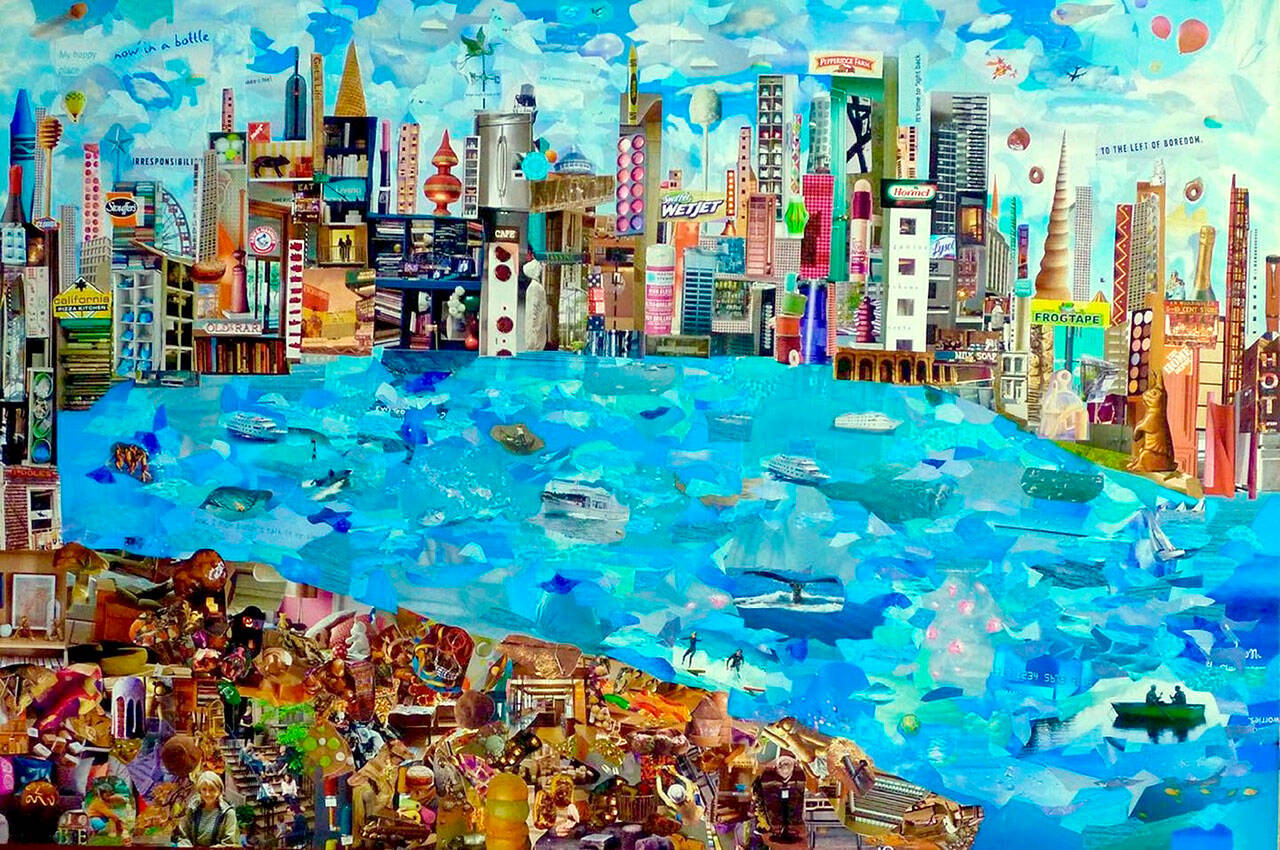 His collages begin with pieces of magazine paper. He then progressively incorporates smaller bits of paper with a matte gel adhesive.“His process is gradual, intuitive and improvisational, resulting in dynamic, intriguing and lively works of art,” said Patricia Webber of the league.