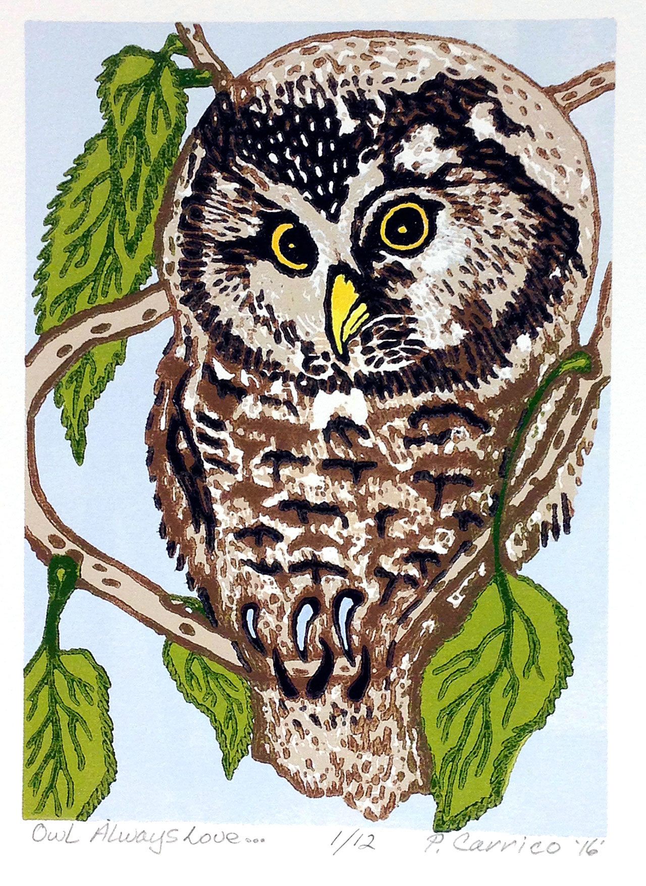 He does woodcuts and wood engravings that begin with a sketch that is transferred to a block of wood. From there, Carrico uses special tools to hand-carve the block and pulls original prints from the block.