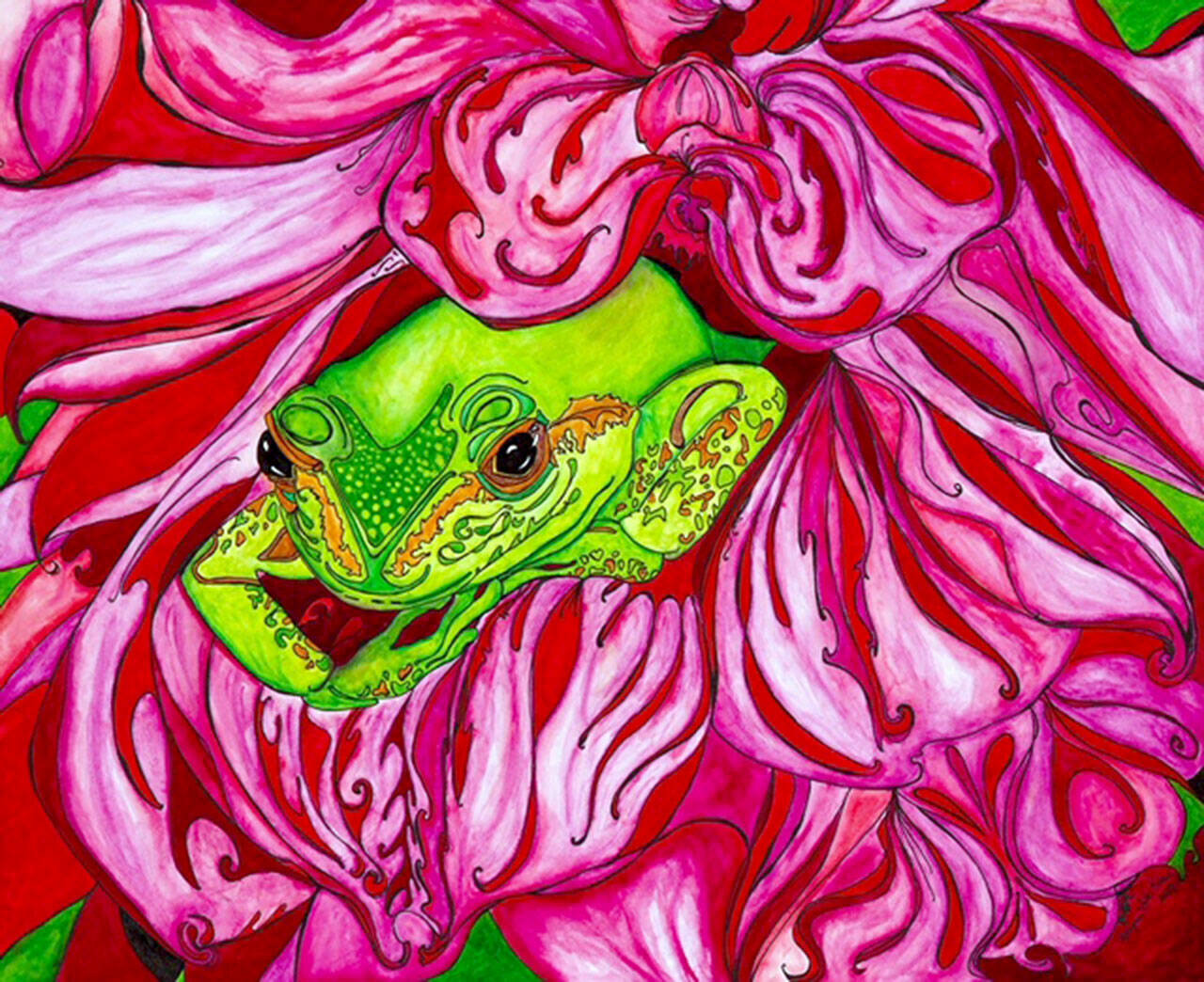 Faces fascinate her and are her preferred subject matter. She begins with a pencil sketch, then outlines it in archival ink. Once layers of color are added, she outlines in black once more. She also uses watercolor brush pens, water-soluble colored pencils, chalk and acrylic paint.