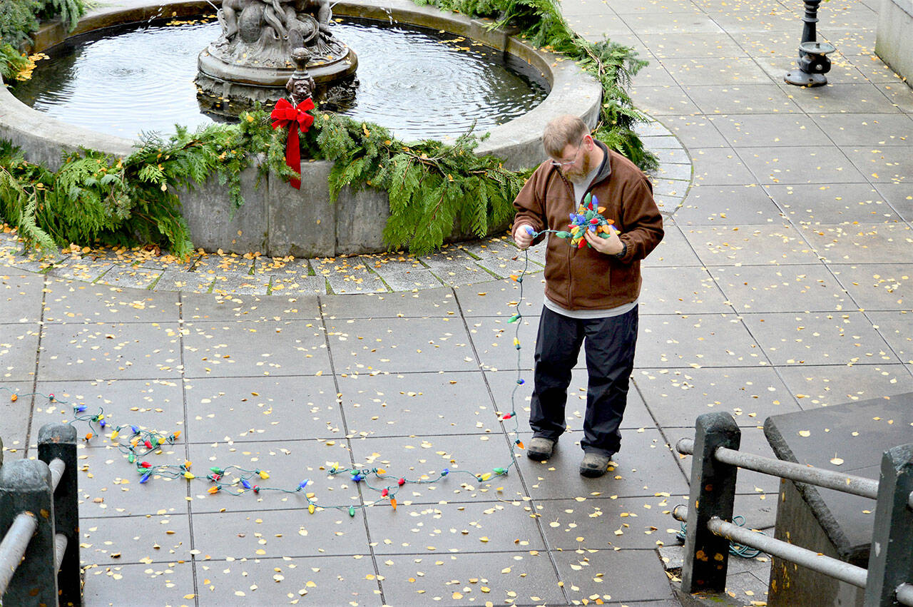 PORT TOWNSEND — Ted Krysinski could only estimate the number of red, green, gold and blue LED lights about to illuminate the community Christmas tree beside the Haller Fountain.