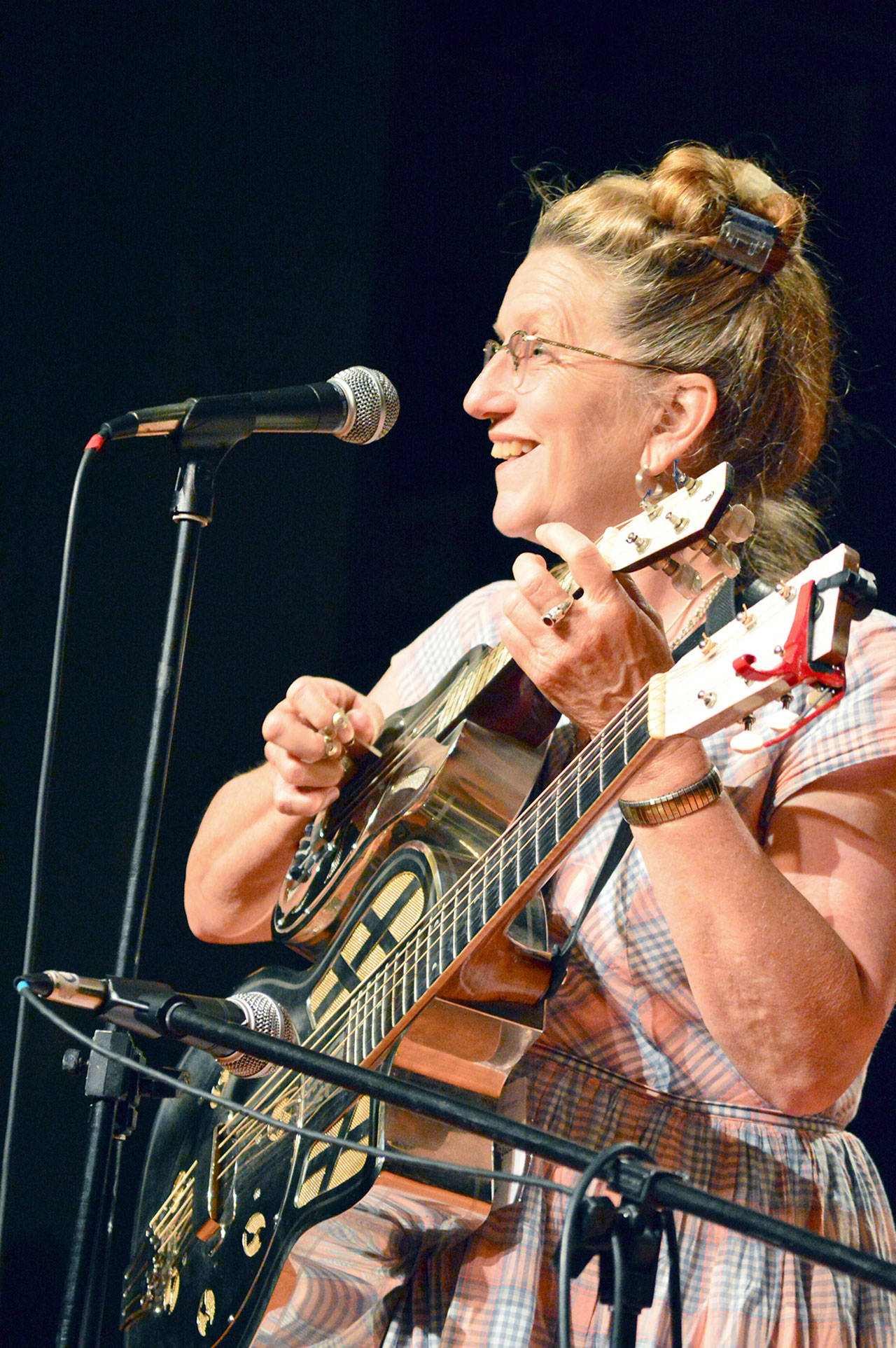 Resplendent in her vintage attire, Rey plays a custom-made resonator ukulele while telling tales — about blues legend Memphis Minnie as well as that nutty neighbor who borrowed everything in her home.