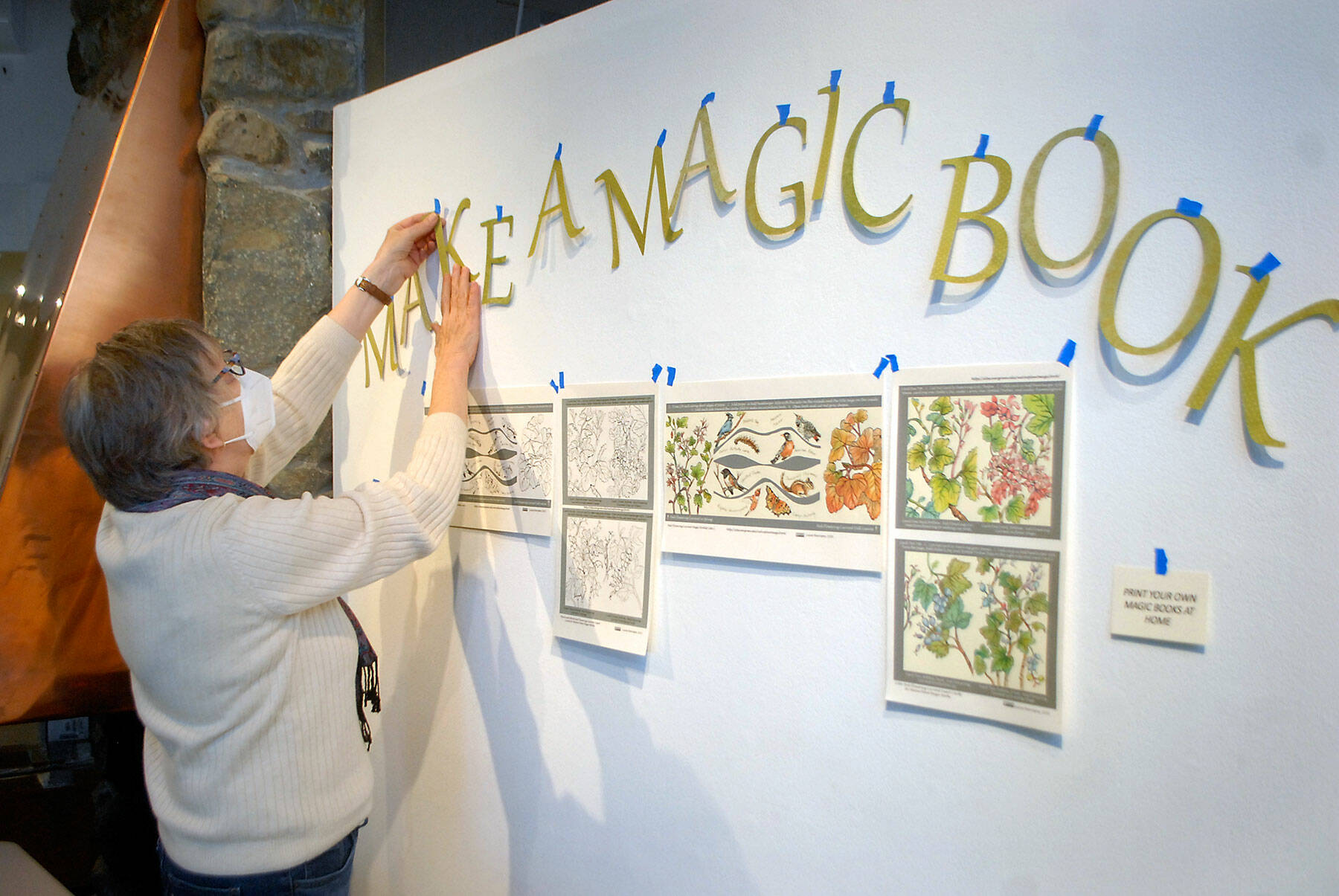 “This show is fun,” said center staffer Rachel Storck, “because there are a lot of different ways things are presented. We have books you can open and interact with, along with the things displayed on the wall,” plus a microscope station.