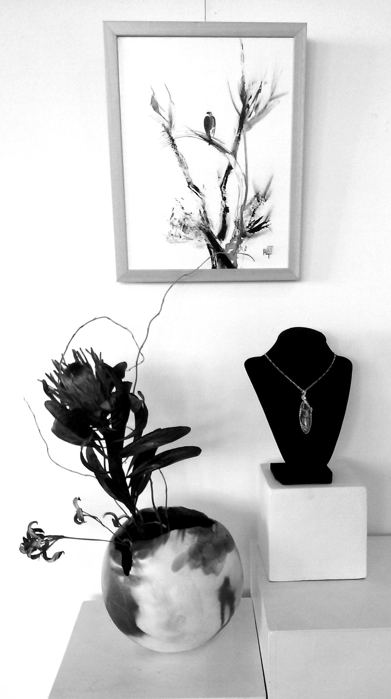 “The bold graphic punch of black and white that stimulates and sharpens the mind is modified by soft tones of grey, which lull one into a reflective meditative mood. This dichotomy asks what is going on here?”