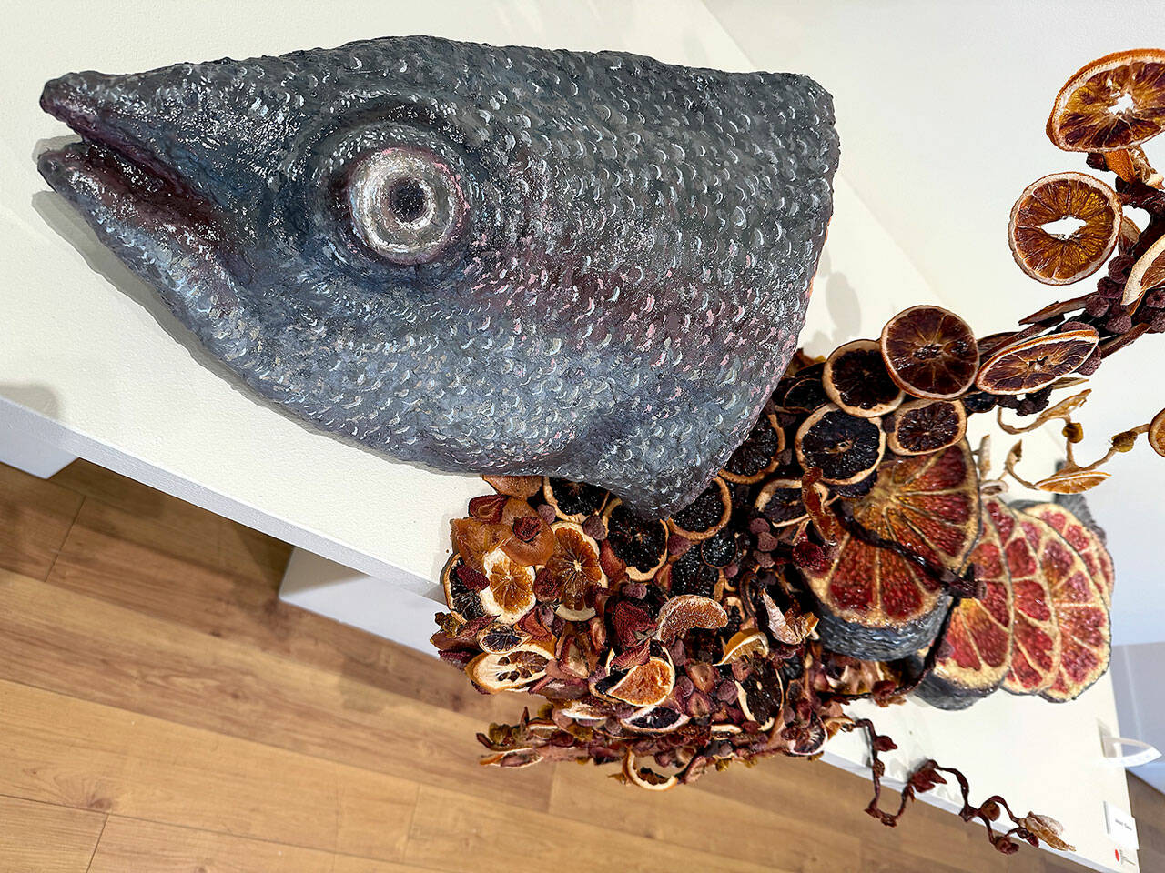 The 4-foot-long papier-maché trout, which has a cascade of dried citrus fruit slices rising above it, was among 96 pieces of food-oriented art in the show at Northwind’s Jeanette Best Gallery, 701 Water St., Port Townsend.