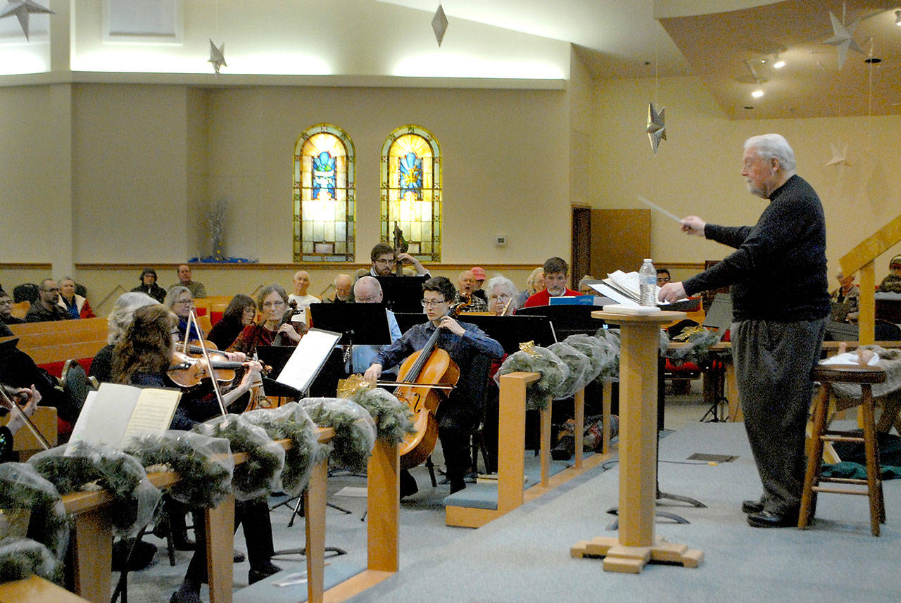 Jerome L. Wright conducts the orchestra during the overture to Handel’s “Messiah” on Saturday in Sequim. (Keith Thorpe/Peninsula Daily News)