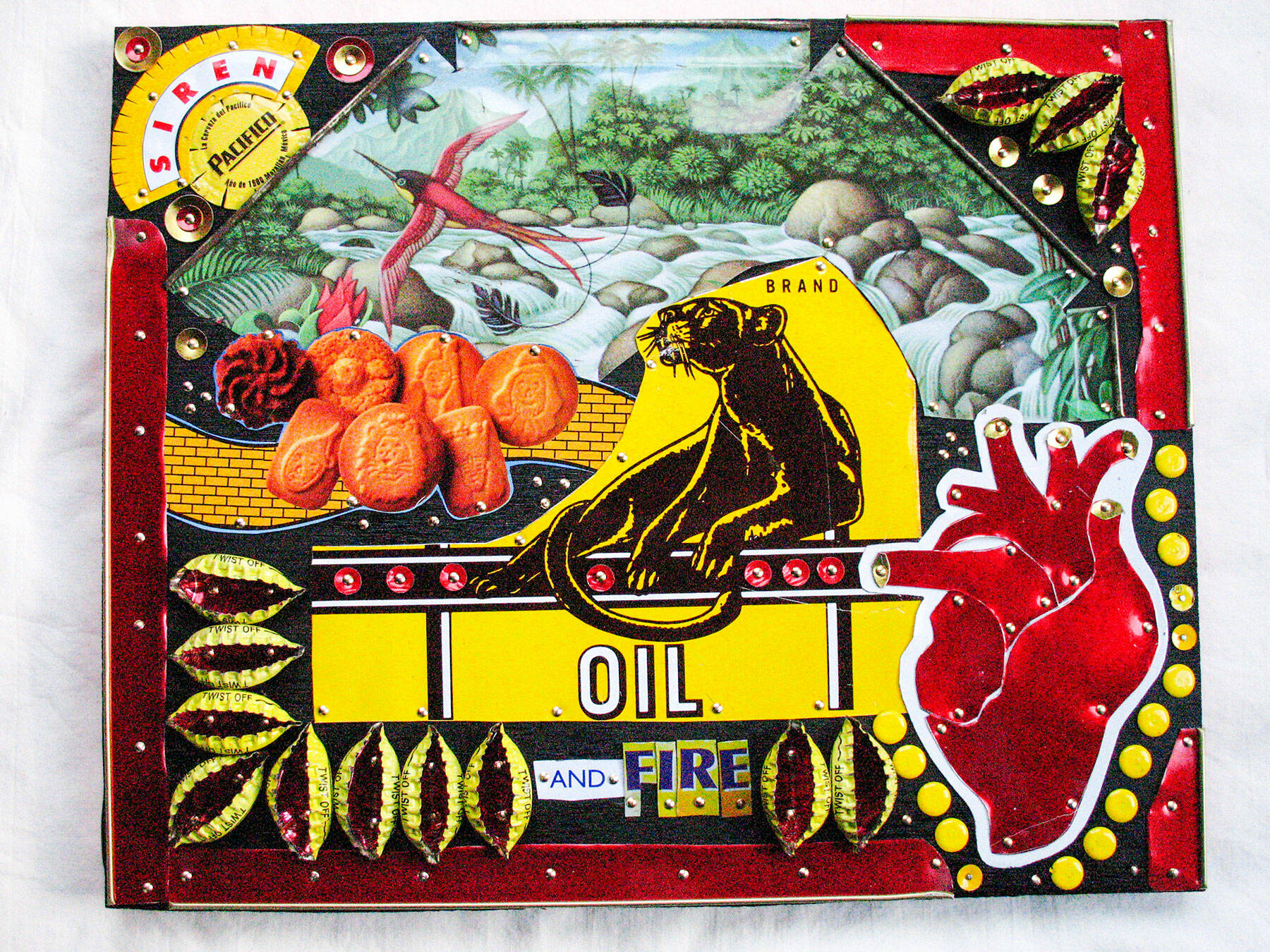 Scruggs’ artwork is about joy, play and reuse. She looks for printed tin and bottle caps, with their color and glints of shine. Labels and advertising iconography often are brightly colored with simple words and images very much like children’s educational toys.