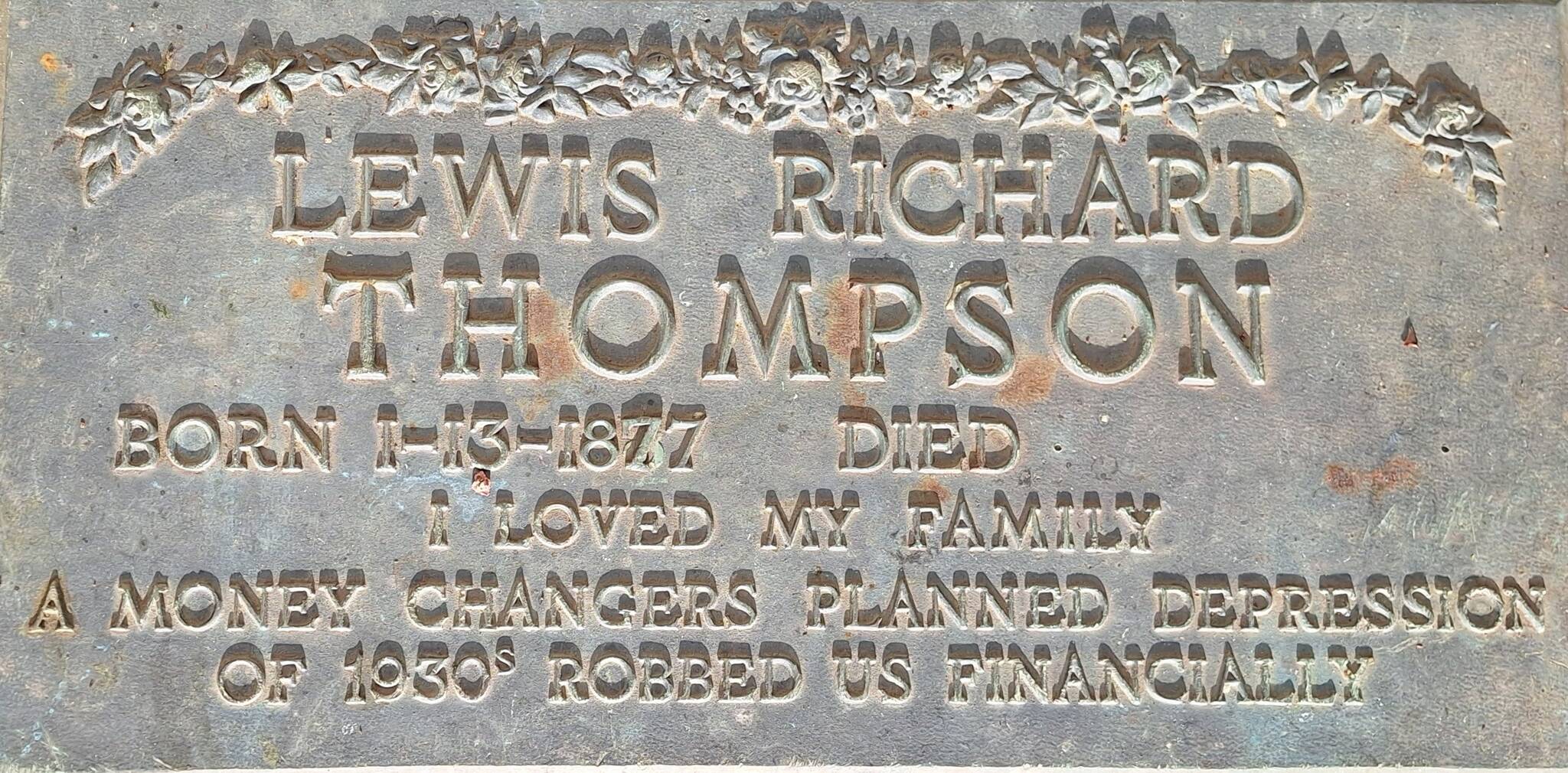Even then, there were conspiracy theories out there. A member of my family, Lewis R. Thompson, had his grave marker made well before his death. On it was written, “A money changers planned depression of 1930s robbed us financially.” Lew’s family made it clear that they would not use that grave marker when he died. Lew died in 1974, and his official grave marker has only name and dates on it. The offending grave marker currently sits quietly beside my house. (Yes, that is a level of weird.)