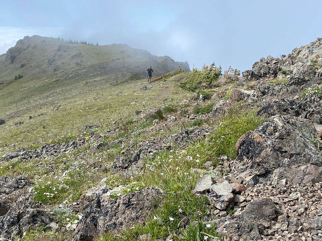 Several basalt exposures along the summit ridge blocked the wind for social-distancing hikers who were admiring the views of the upper Dungeness River basin.
