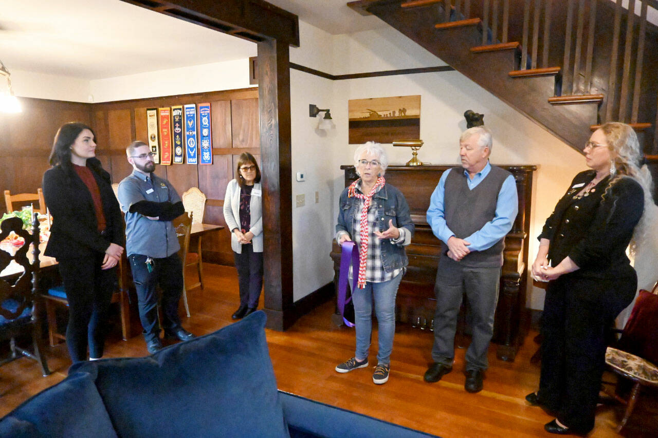 Representatives from Sequim’s Black Bear Diner and Sequim Holiday Inn & Suites joined Schultz at the home recently to present the funds and unveil the carved bear, and to get a glimpse inside of the 1910 Tudor-style craftsman house.