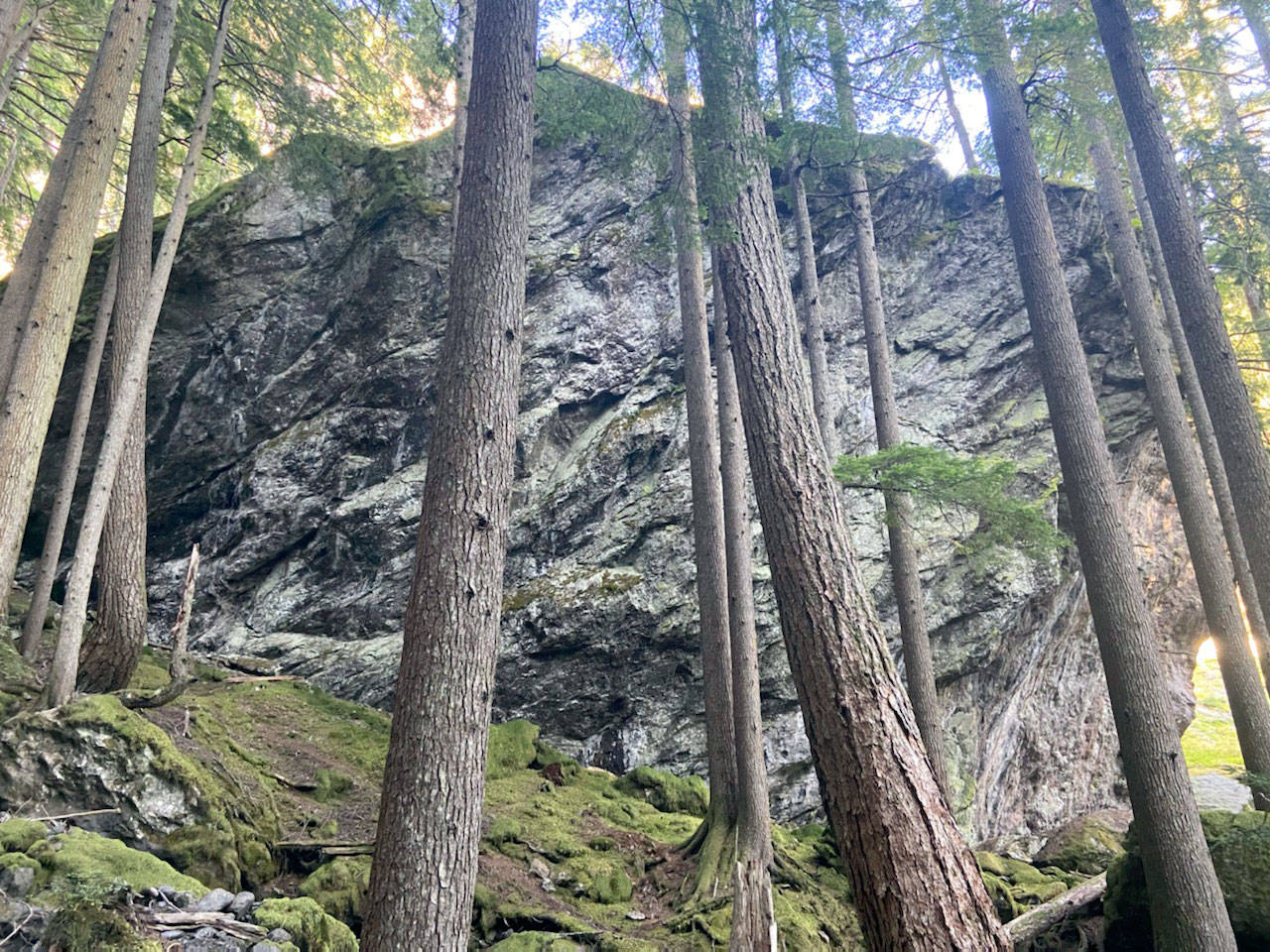 The lower third of the route was burned in a 2009 forest fire. The middle third follows subterranean Constance Creek up a forested canyon scattered with massive boulders. The creek reemerges on the upper third of the ascent before Lake Constance emerges through the trees.