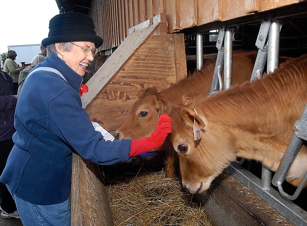 Sandra Crook of Port Angeles pets a calf at the Dungeness Valley Creamery north of Sequim on Saturday. The creamery was one of seven farms and businesses taking part in the 20th annual Clallam County Farm Tour, a celebration of the agricultural heritage of the Dungeness Valley. (Keith Thorpe/Peninsula Daily News)