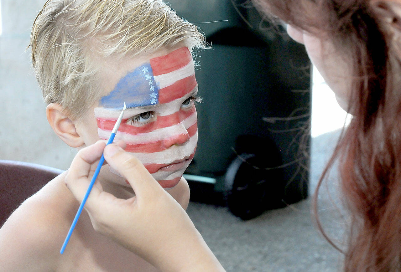 Zane Rensen, 6, of Port Angeles receives patriotic face paint from Port Angeles High School cheerleader Madison Bishop in the children’s activity tent at Port Angeles City Pier during Friday’s Independence Day celebration. (KEITH THORPE/PENINSULA DAILY NEWS)