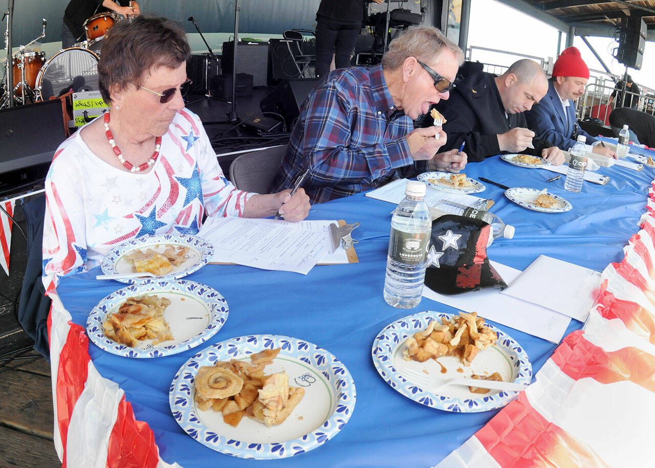 Apple pie judges, from left, Carol Johnson, Clallam County Commissioner Randy Johnson, U.S. Navy Senior Chief John Wheeler and Port Angeles Waterfront District Executive Director Sam Grello taste this year’s entries at the annual Independence Day pie contest at Port Angeles City Pier. A total of 16 pies were entered in this year’s competition. (KEITH THORPE/PENINSULA DAILY NEWS)