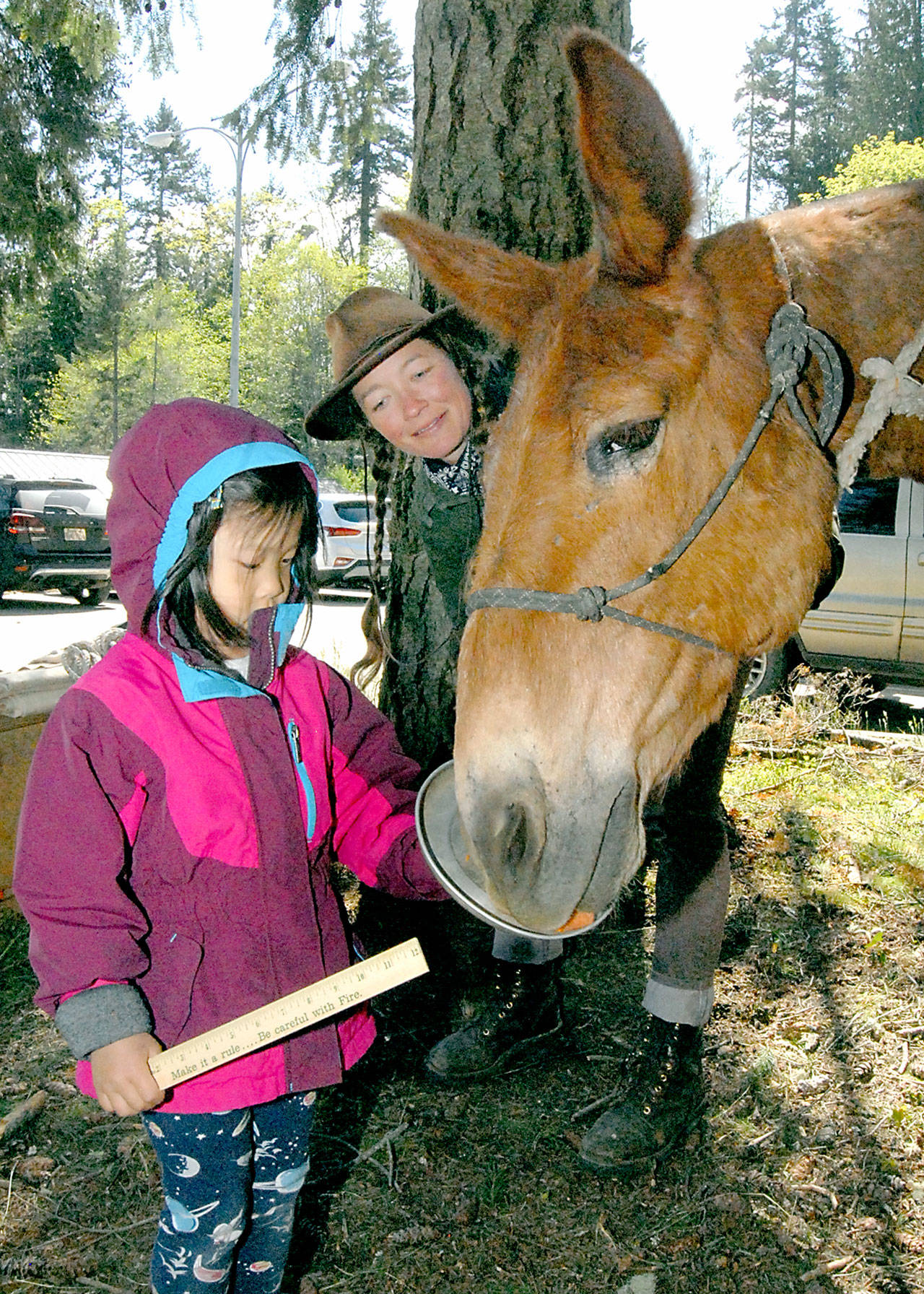 Above, Olympic National Park firefighter Paul Staley directs 3-year-old Owen Bailey of Gig Harbor where to point a fire hose as part of Junior Ranger Day on Saturday at the park’s Port Angeles visitor center. The park provided a variety of displays, activities and demonstrations to promote nature and the wilderness experience. At left, 4-year-old Jennifer Sun of Seattle feeds a piece of carrot to Sox, a backcountry mule, as Olympic National Park animal caretaker Heidi Brill looks on.