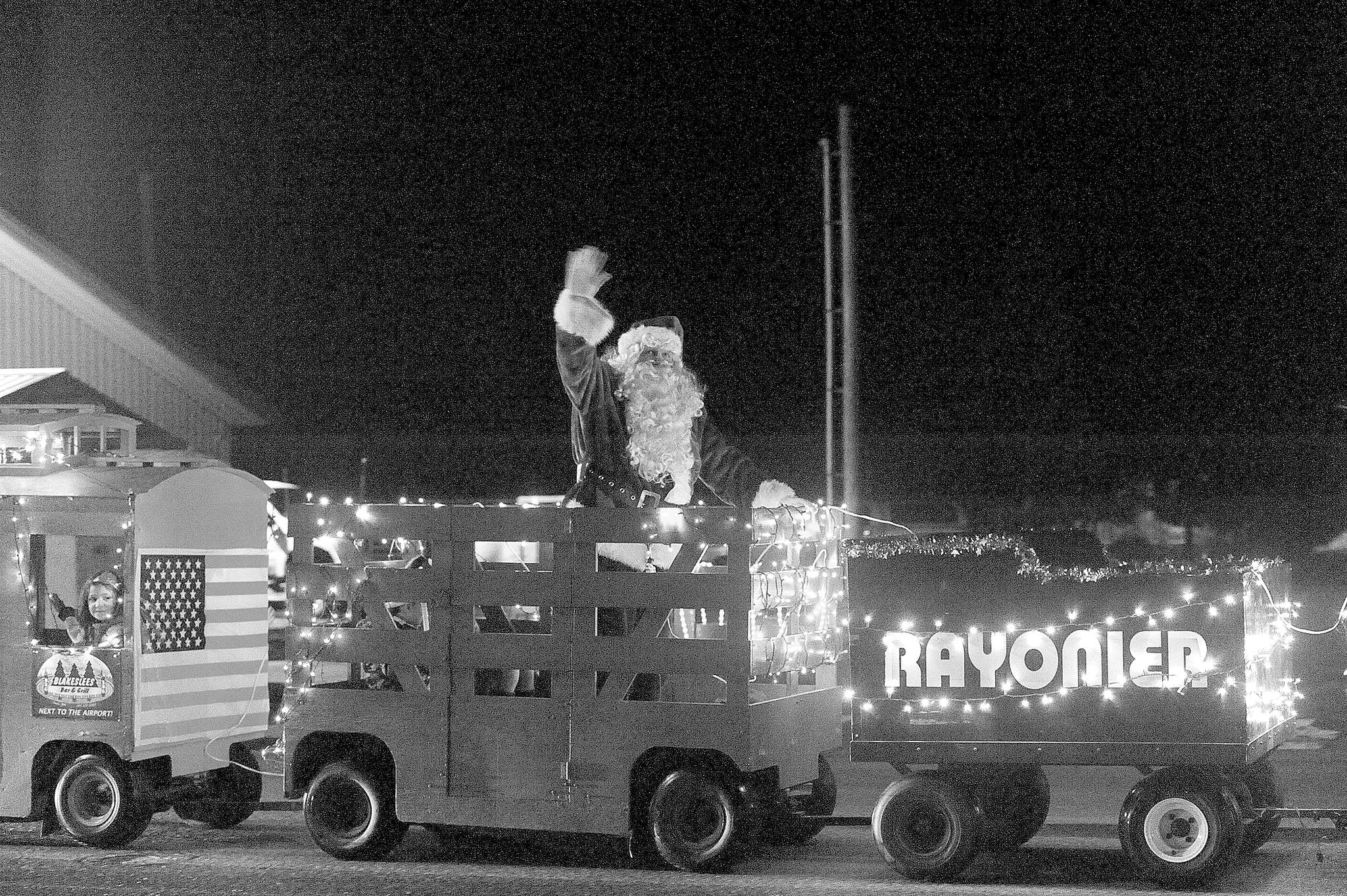 Above, Santa rides on the West End Business & Professional Association’s train during the Twinkle Light Parade down Forks Avenue, en route to the Christmas tree lighting on Saturday evening.