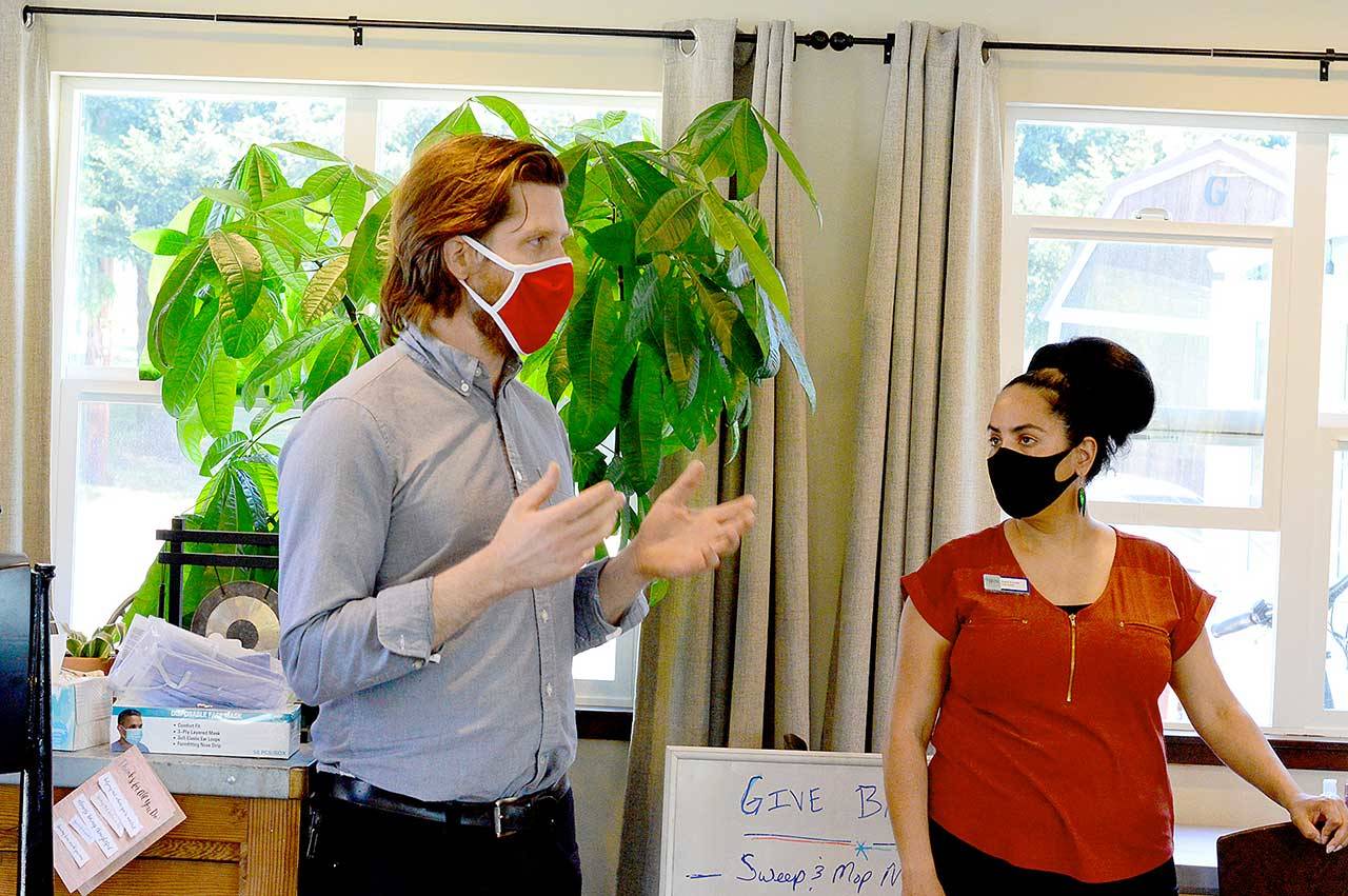PORT TOWNSEND — The sounds of fiddle and guitar, courtesy of buskers Alea Waters and Lang Russel, floated into the warm air. Walking up to the front porch, people smiled at each other from behind their cloth masks, and then Brian Richardson invited everybody in for announcements and a free, just-made lunch.
