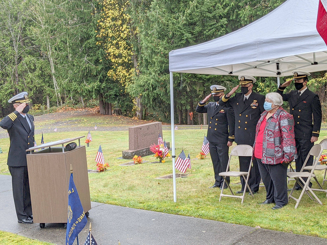 Naval Facilities Engineering Systems Command Northwest Executive Officer Capt. Angel Santiago, left, and Commanding Officer Capt. Ben Miller salute the grave of Medal of Honor recipient Navy Petty Officer Marvin G. Shields during the annual Veterans Day ceremony at the Gardiner Cemetery.