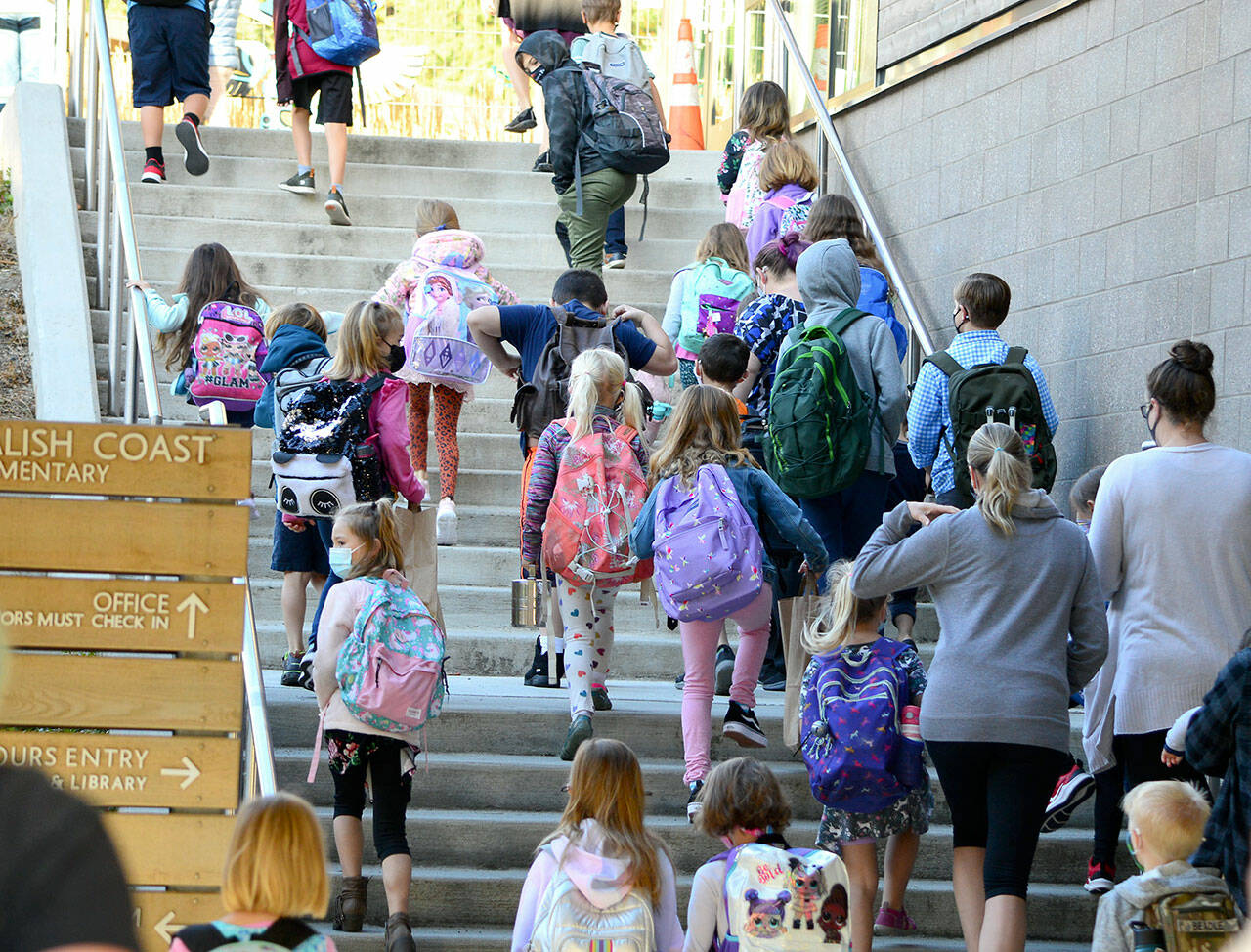 Jamie Haney, above, helps her fourth-grader, Elise, prepare for the first day of school Tuesday morning at Salish Coast Elementary in Port Townsend. The school has 408 students enrolled in kindergarten through fifth grade; 21 were absent Tuesday, principal Lisa Condran noted. “We are very successfully running outdoor breakfast and lunch to keep our students safe, so we are excited about that,” she added.