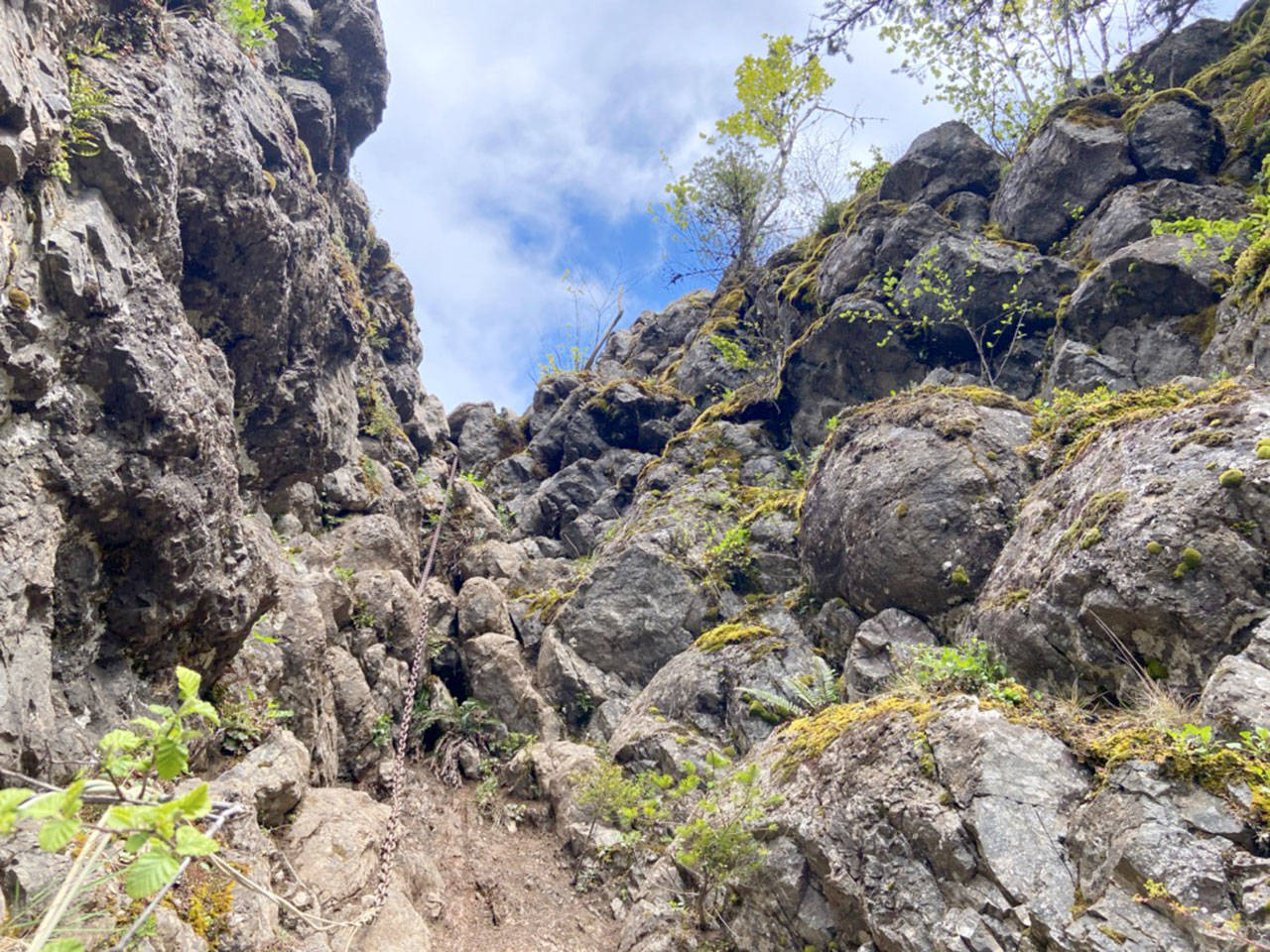 A series of fixed ropes helps hikers keep their footing on a final ascent to a 2,675-foot crag of bedrock that juts out over the ridge.