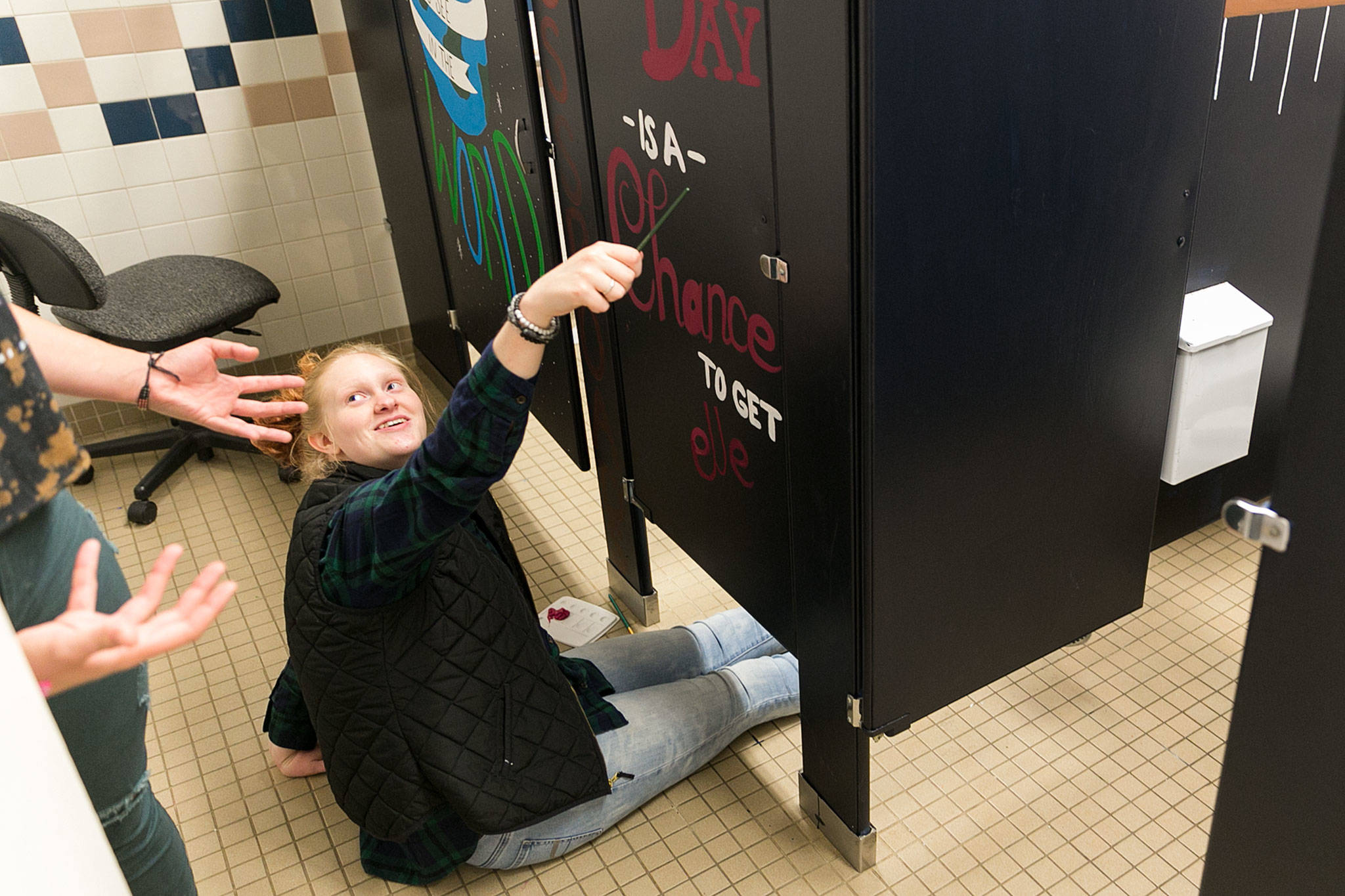 Teens from the leadership class painted the once-blue stalls in the school restrooms black. They returned with more brushes and pallets of colorful paint. The students spent hours decorating the stalls with vibrant pictures and inspirational quotes.